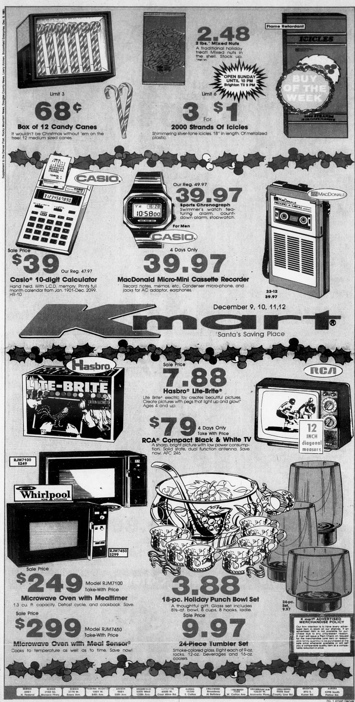 Spotted throughout the “Stranger Things” series, awesome Lite-Brite toys, Casio watches, and mini-cassette recorders are shown here for your holiday wish list, available in this Kmart advertisement page from The Broomfield Enterprise, December 10, 1981.