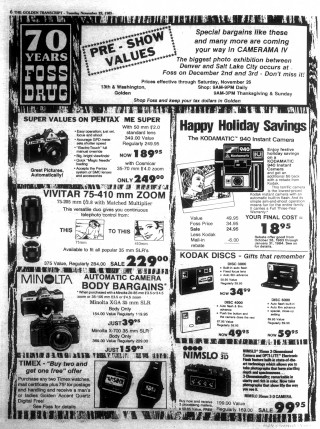 Jonathan Byers, Will’s older brother, is handy at capturing images with his camera. When it gets broken, he receives a replacement Pentax MX camera as a (totally wicked) gift, a very similar model to the ME Super on offer in this November 22, 1983 issue of the Golden Transcript.