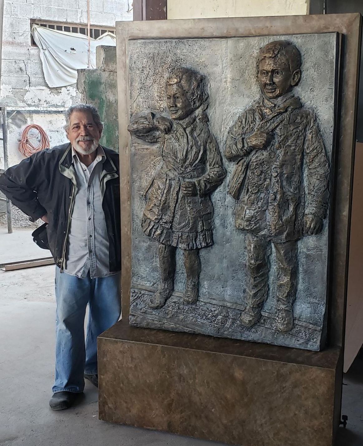 Artist Reynaldo “Sonny” Rivera poses with his bronze sculpture commemorating the 1914 victory over school segregation. The relief was created to hang in the Alamosa Municipal Courthouse in 2022.