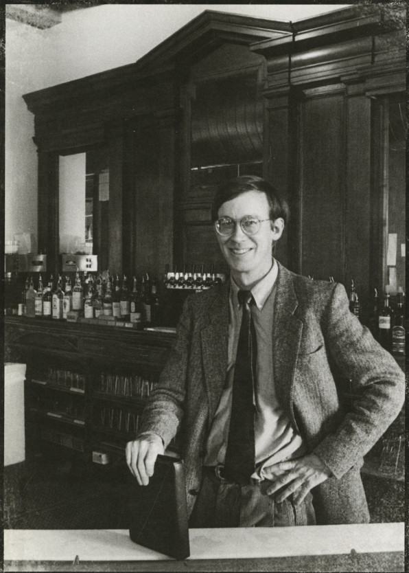 A young John Hickenlooper in a suit poses at a bar with bottles of beer behind him.