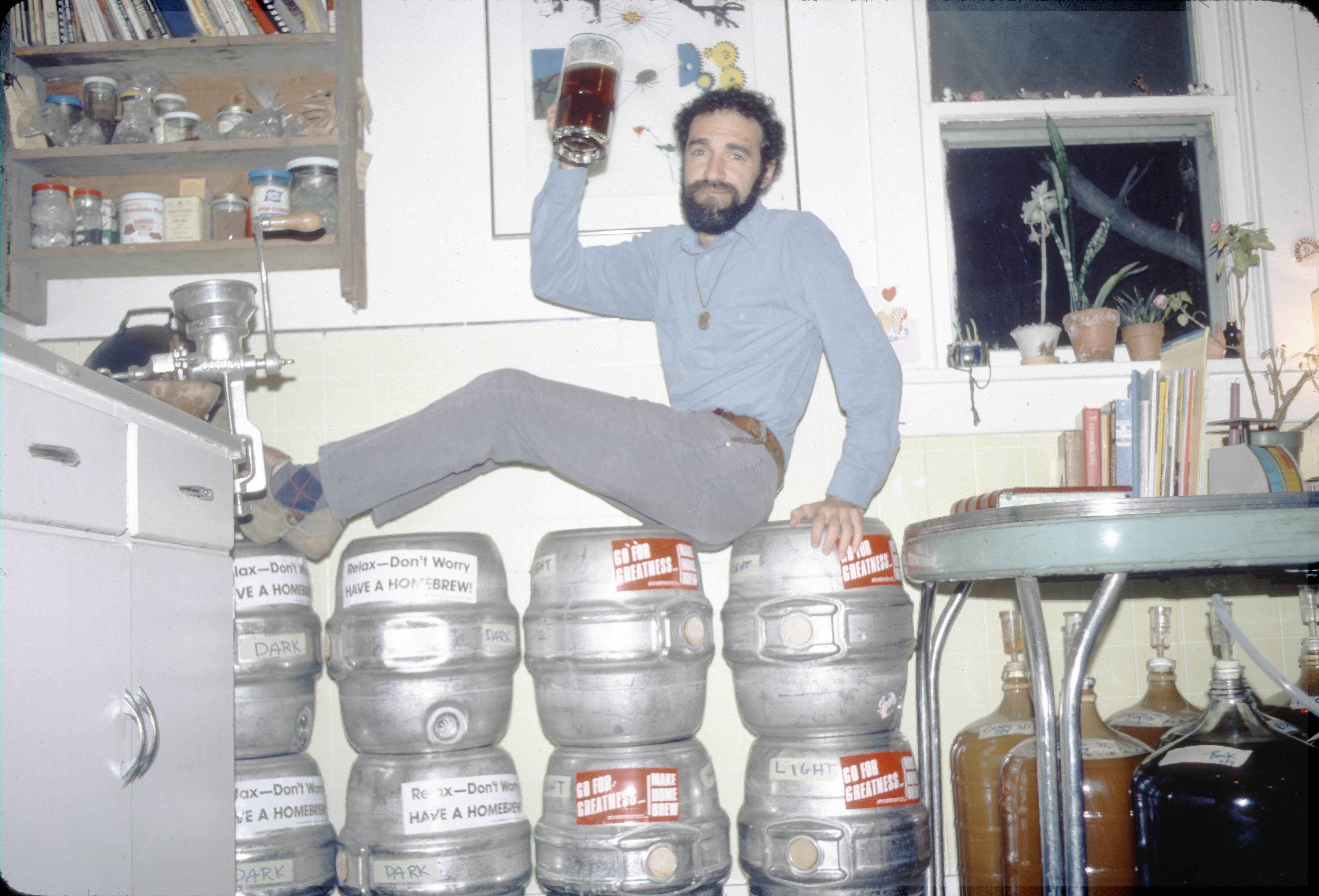 Charlie Papazian posing on a group of kegs. He holds a mug of beer, and jugs of brewing beer are visible underneath a nearby table.