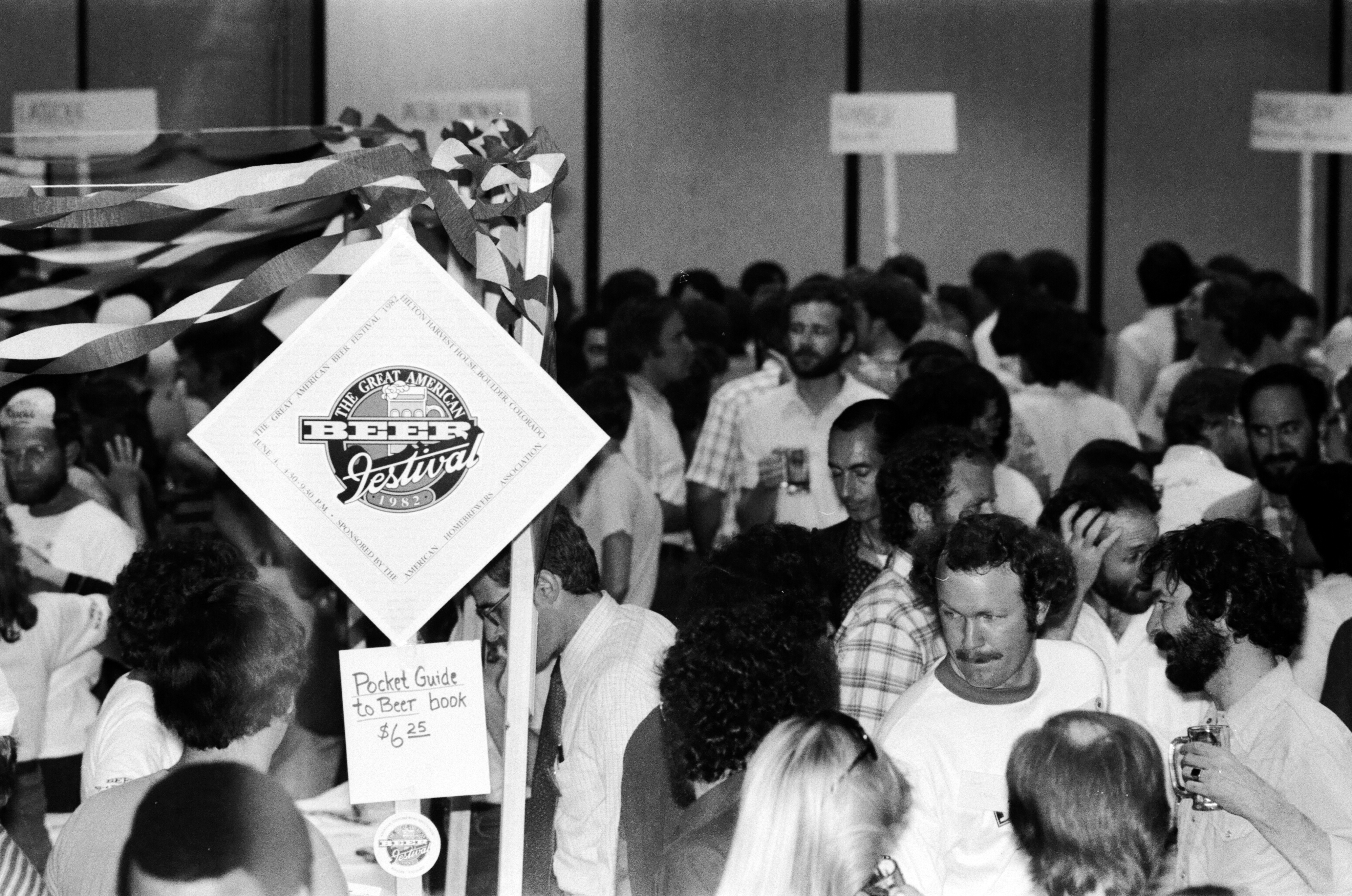 A crowd of people in a building. Above them hangs a sign reading "The Great American Beer Festival, 1982."