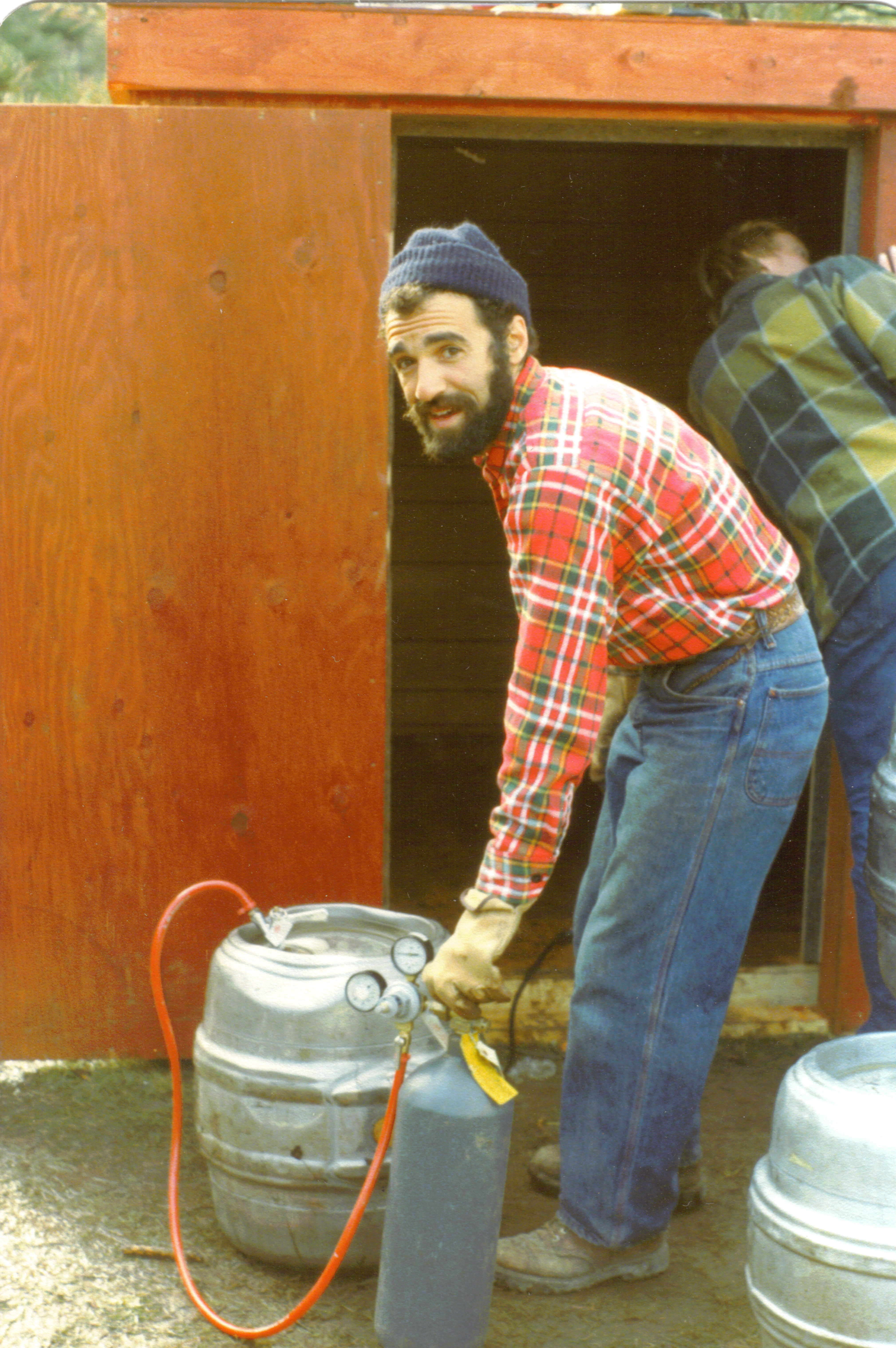 Charlie Papazian pressurizes a keg in the late 1970s.