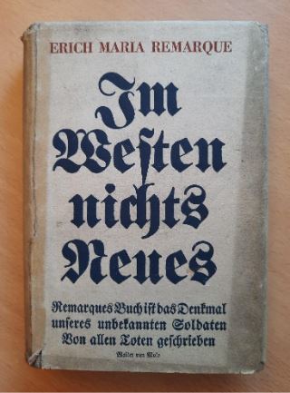 Photograph of a book with a worn white cover. The words on the cover are all in German, and in the center in large black letters the cover of the book reads, "Im Westen nichts Neues" which translates to "All Quiet on the Western Front."  Red block letters across the top of the book spell out the author's name, Erich Maria Remarque.