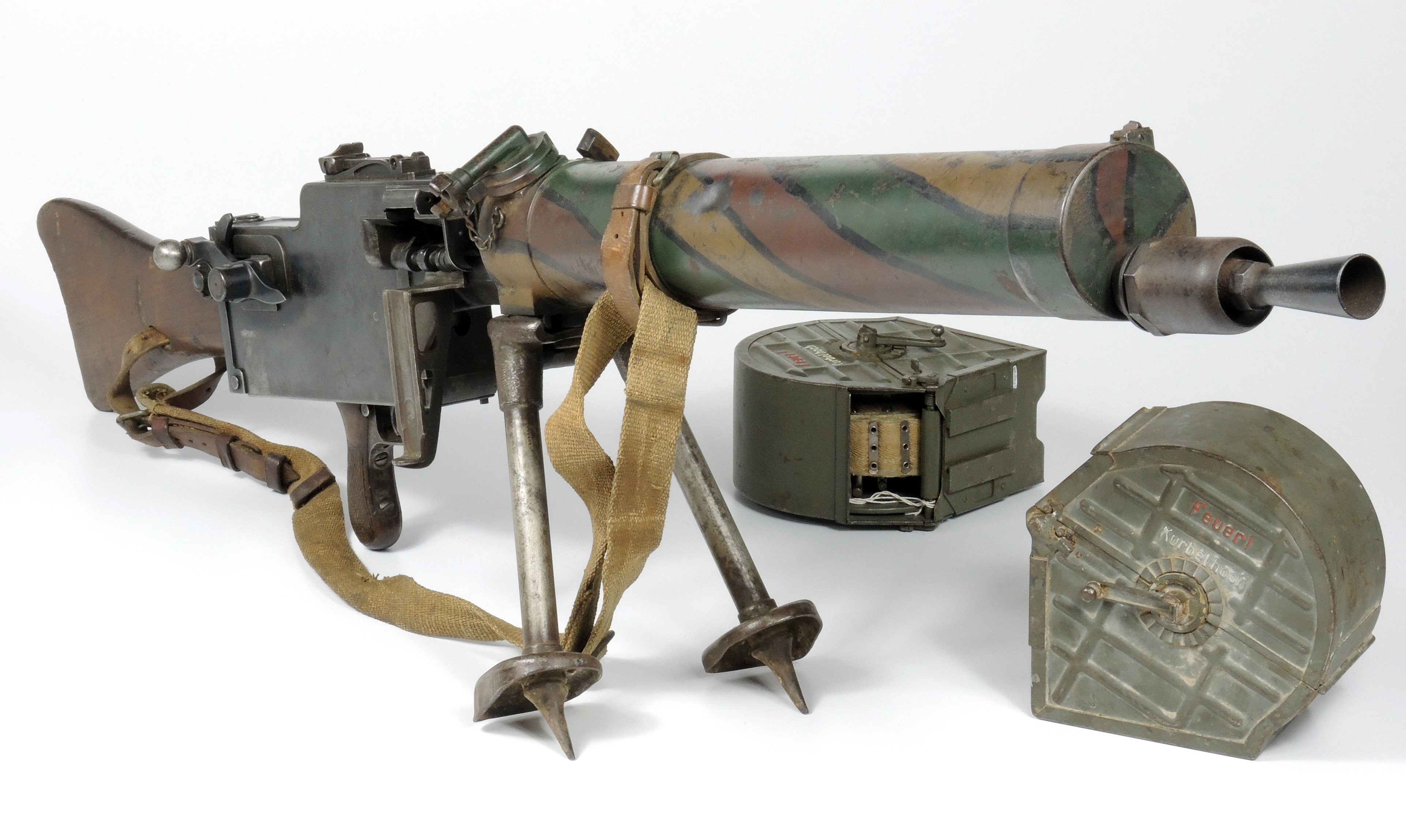 Photo of an Imperial German Model 1908/15 Maxim light machine gun and associated components including two round ammunition boxes with independent feed belts, a bi-pod support, an extra main spring, and an extra barrel.