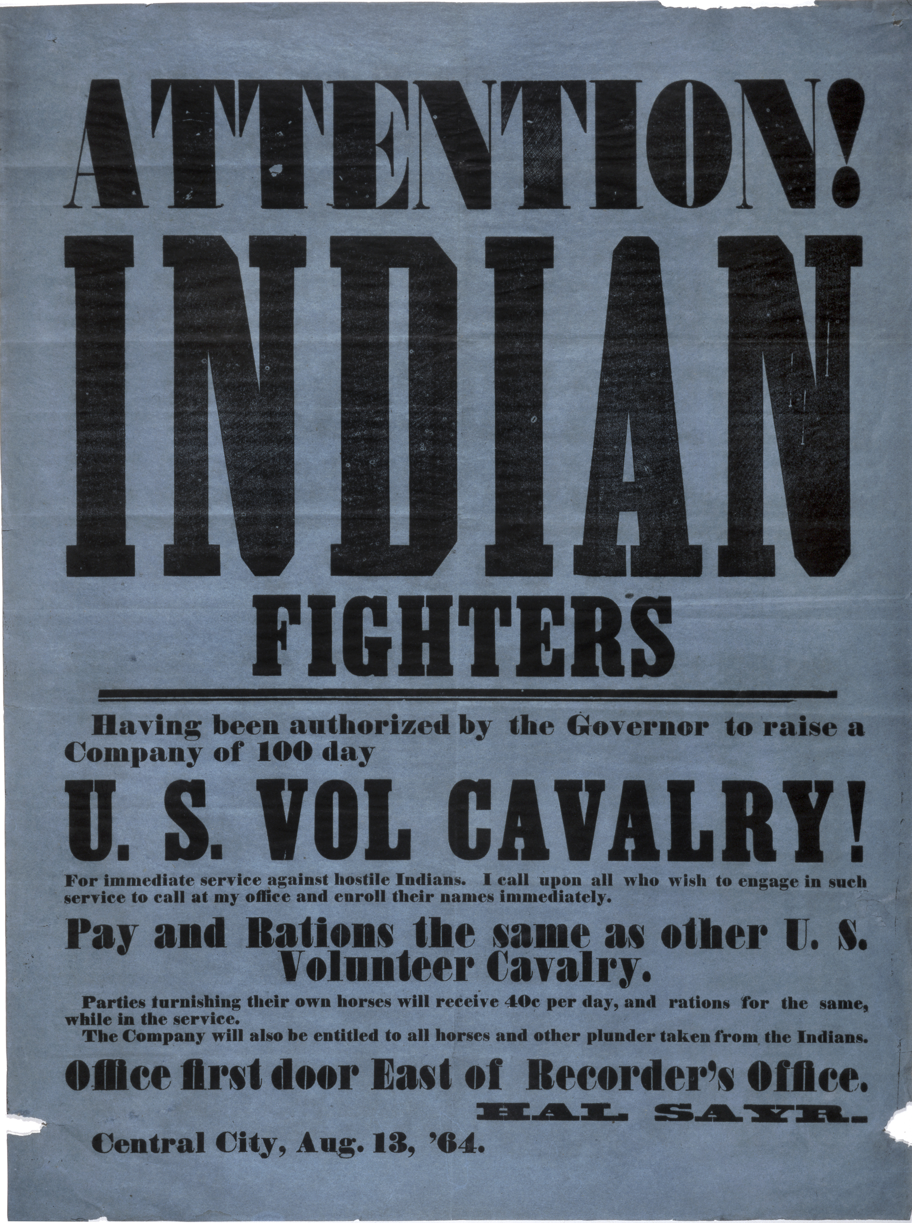A poster advertised for “hundred-day volunteers” to “solve” the Indian war of 1864. These hundred-day volunteers were authorized by the federal government and was present at the Sand Creek Massacre.