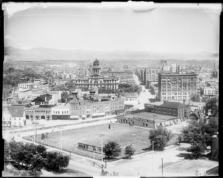 What a difference a hundred or so years makes in Denver’s history. This image was taken from the Colorado State Capitol Building’s dome overlooking the space that is now Civic Center Park. The image, taken by William Henry Jackson at the turn of the twentieth century, shows some notable buildings that are still around today. Can you make any out?