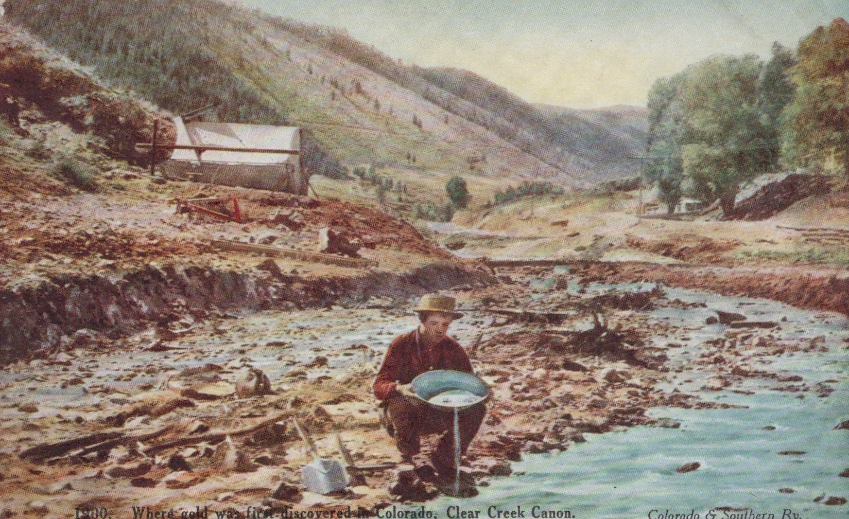 A summer vacation activity (and road trip destination) that could be quintessentially Colorado is gold panning in one of our fabulous creeks or streams. The 1859 Gold Rush changed Colorado’s landscape forever and gold panning is still something folks can do today. Whilst locations vary, this image of Clear Creek Canyon (and, according to this postcard, the place where gold was first discovered in Colorado) may give us some inspiration!