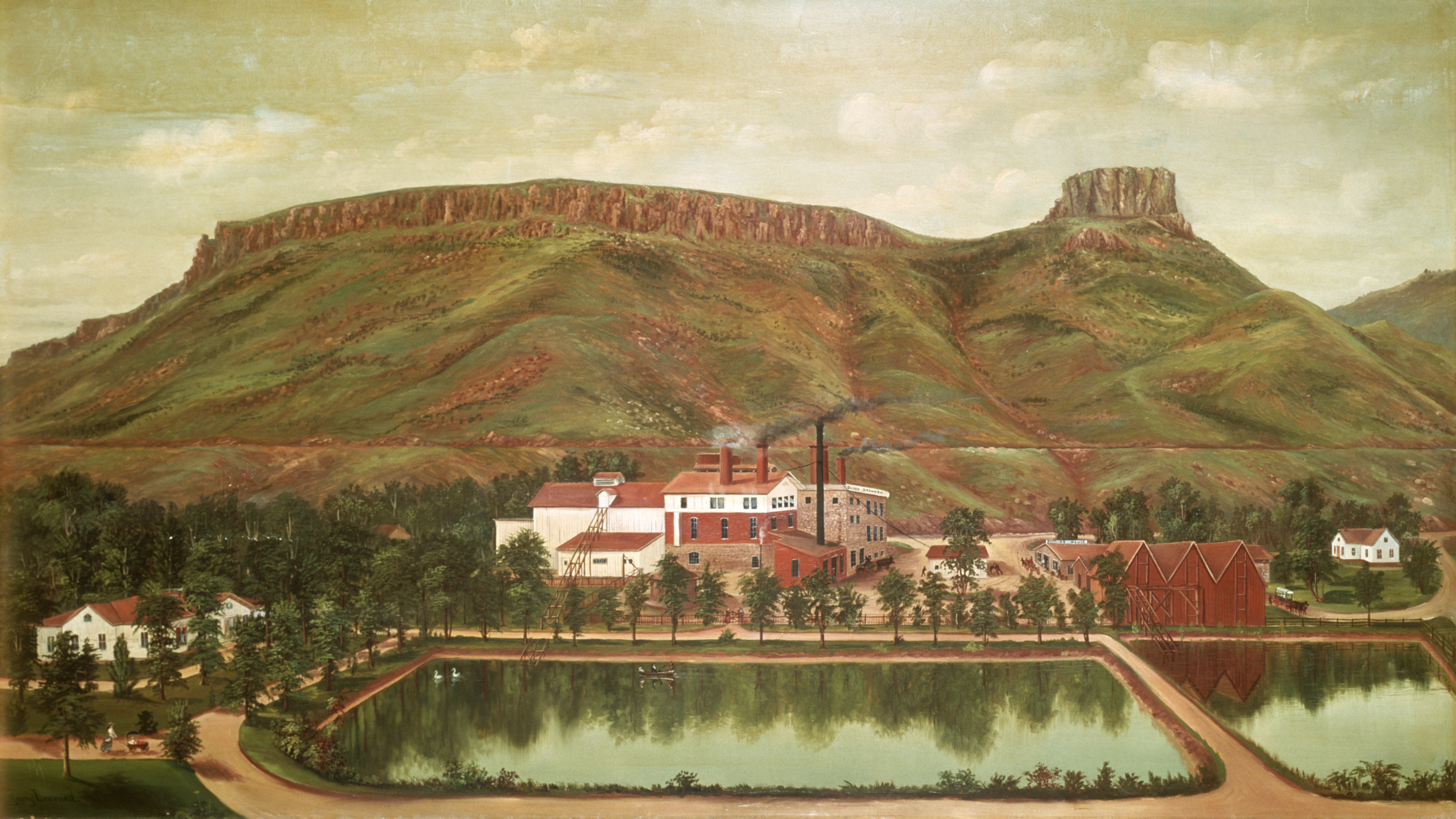A watercolor depicting the Coors brewery as it looked in 1884, about a decade after Adolph Coors and Jacob Schueler repurposed an old tannery along the banks of Clear Creek in Golden, Colorado.