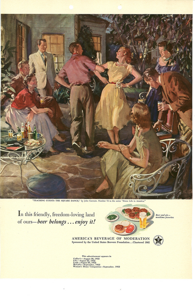 Created by some of the best commercial artists and illustrators of the day, the ads ran in popular magazines such as Time, The Saturday Evening Post, Collier’s, U.S. News, and more. Each idyllic vignette featured white middle-class men and women enjoying leisure time and beers together, and most featured larger groups of smiling friends and family with even numbers of men and women. Prohibition had only been over for a little more than two decades, and every ad insisted that “Beer Belongs,” often appealing to patriotism and the hunky-dory post-war optimism flooding the country: “In this friendly, freedom-loving land of ours—beer belongs. . . enjoy it!” Many also reminded viewers, emphatically, that beer is “America’s Beverage of Moderation.”