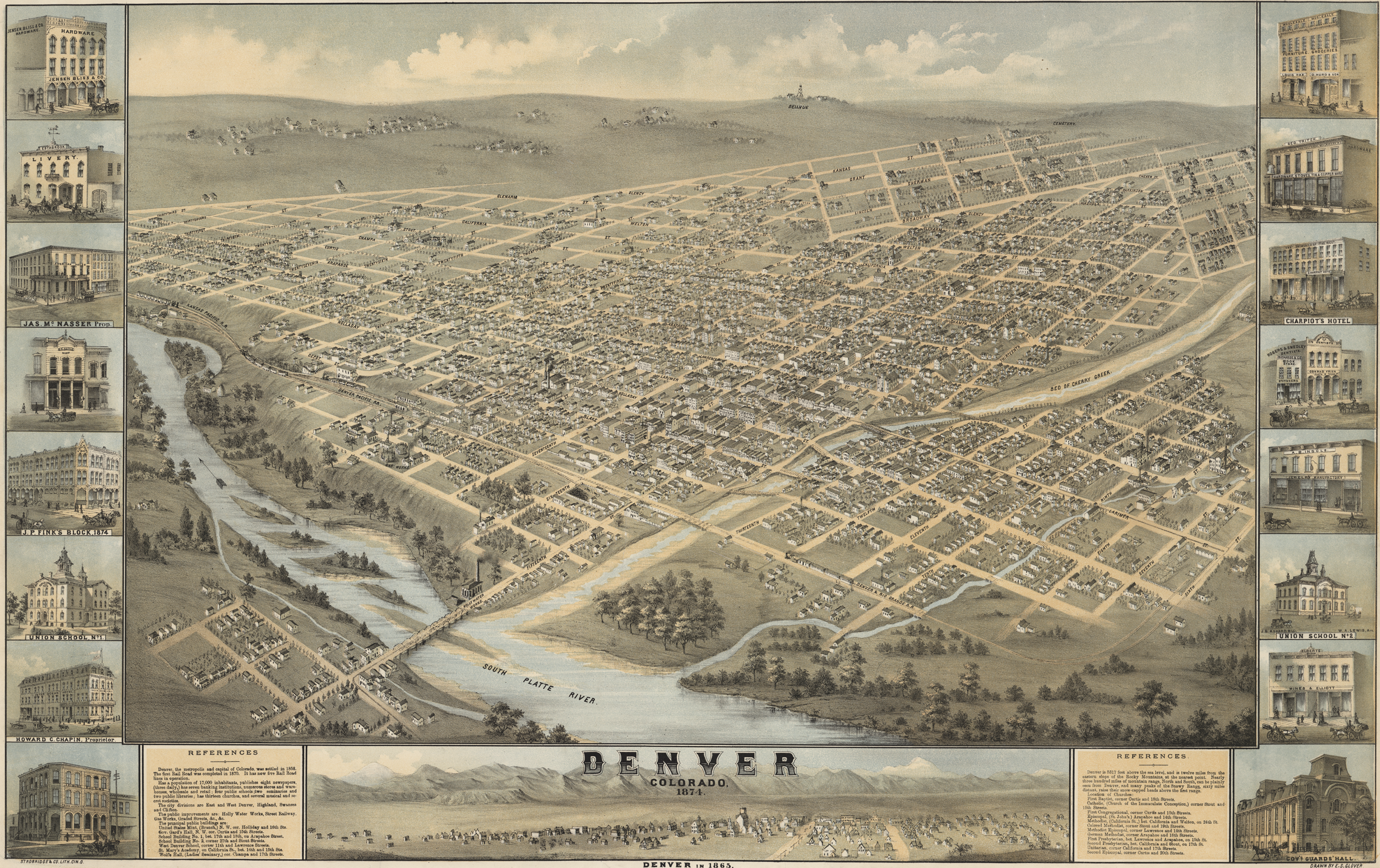 Bird’s-eye view of Denver from the North West looking South East, 1874.
