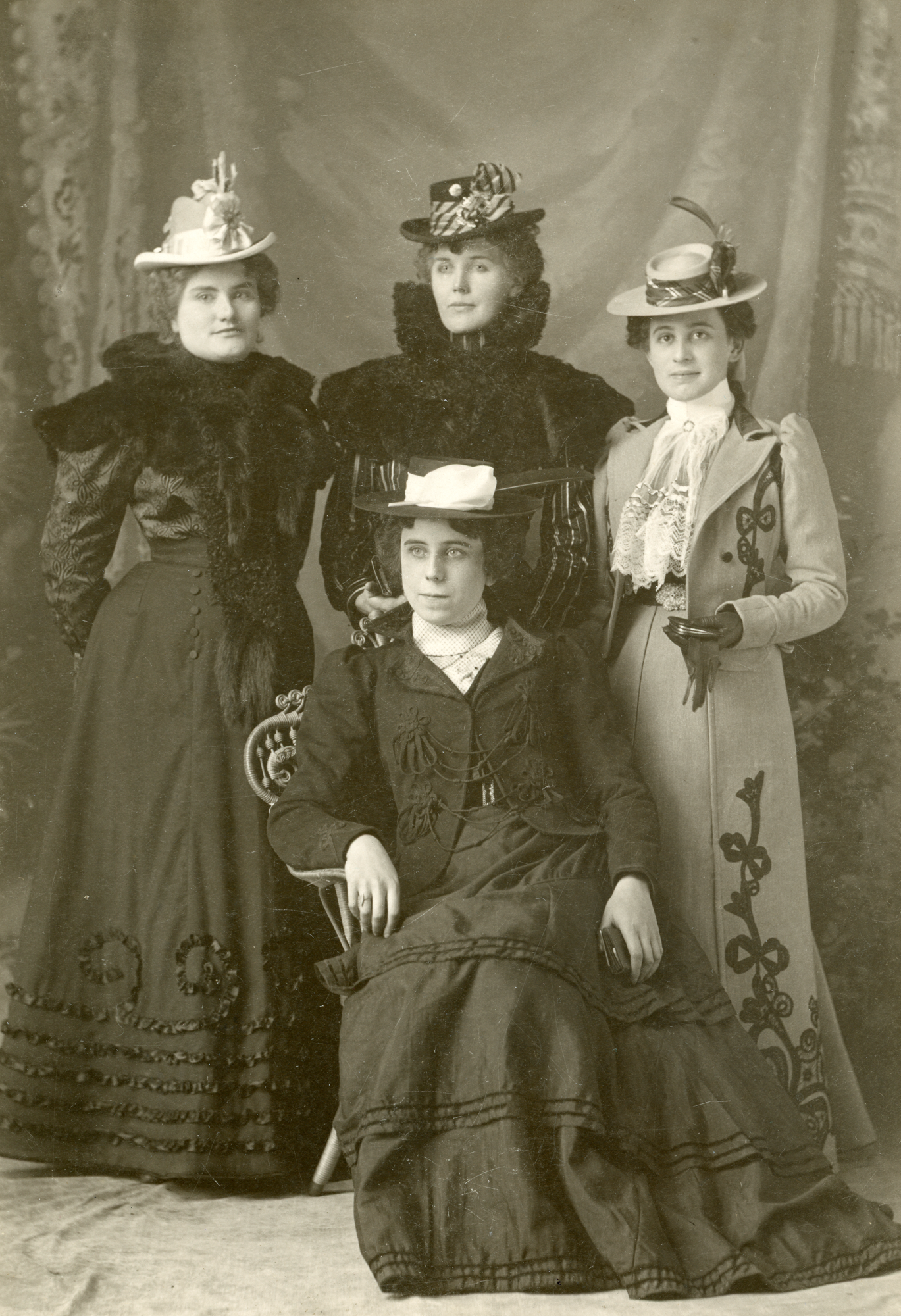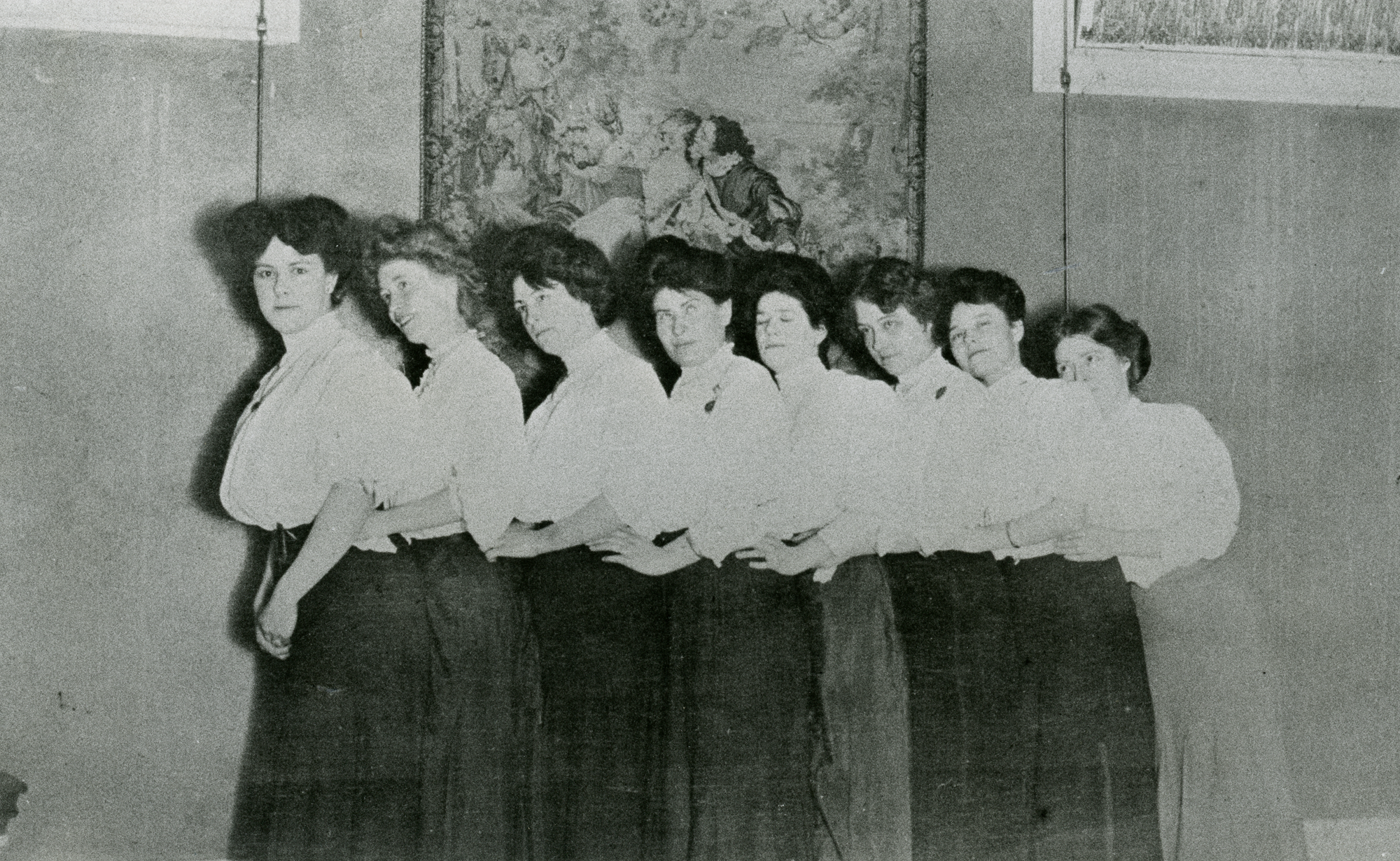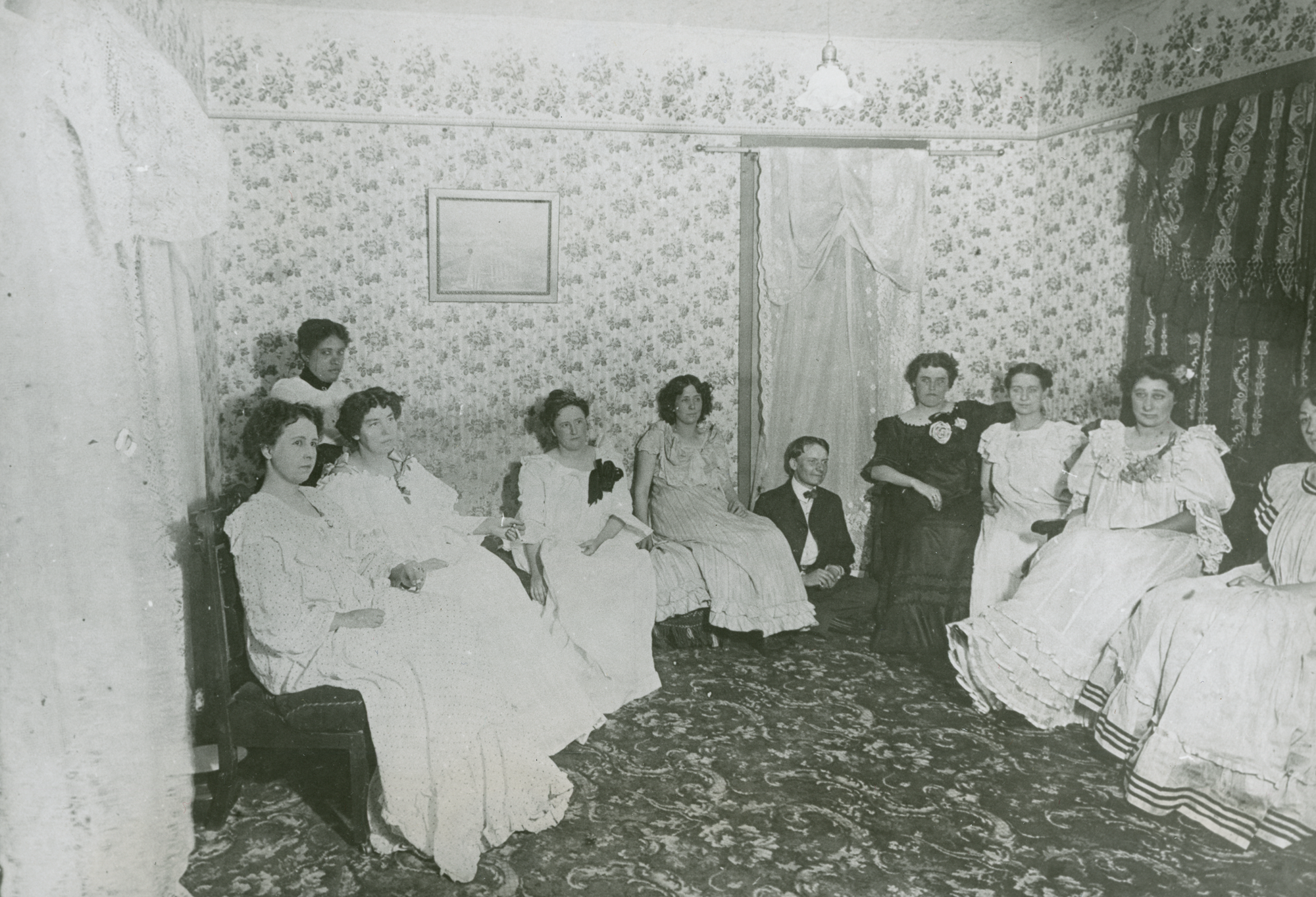 Madam Anna “Gouldie” Gould’s boarders lined up in front of a tapestry.