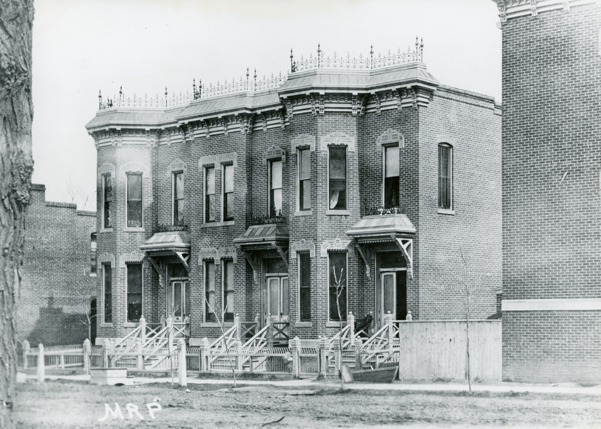 Three brick parlor houses or brothels along Holladay Street, later Market Street, in early Denver, Colorado.