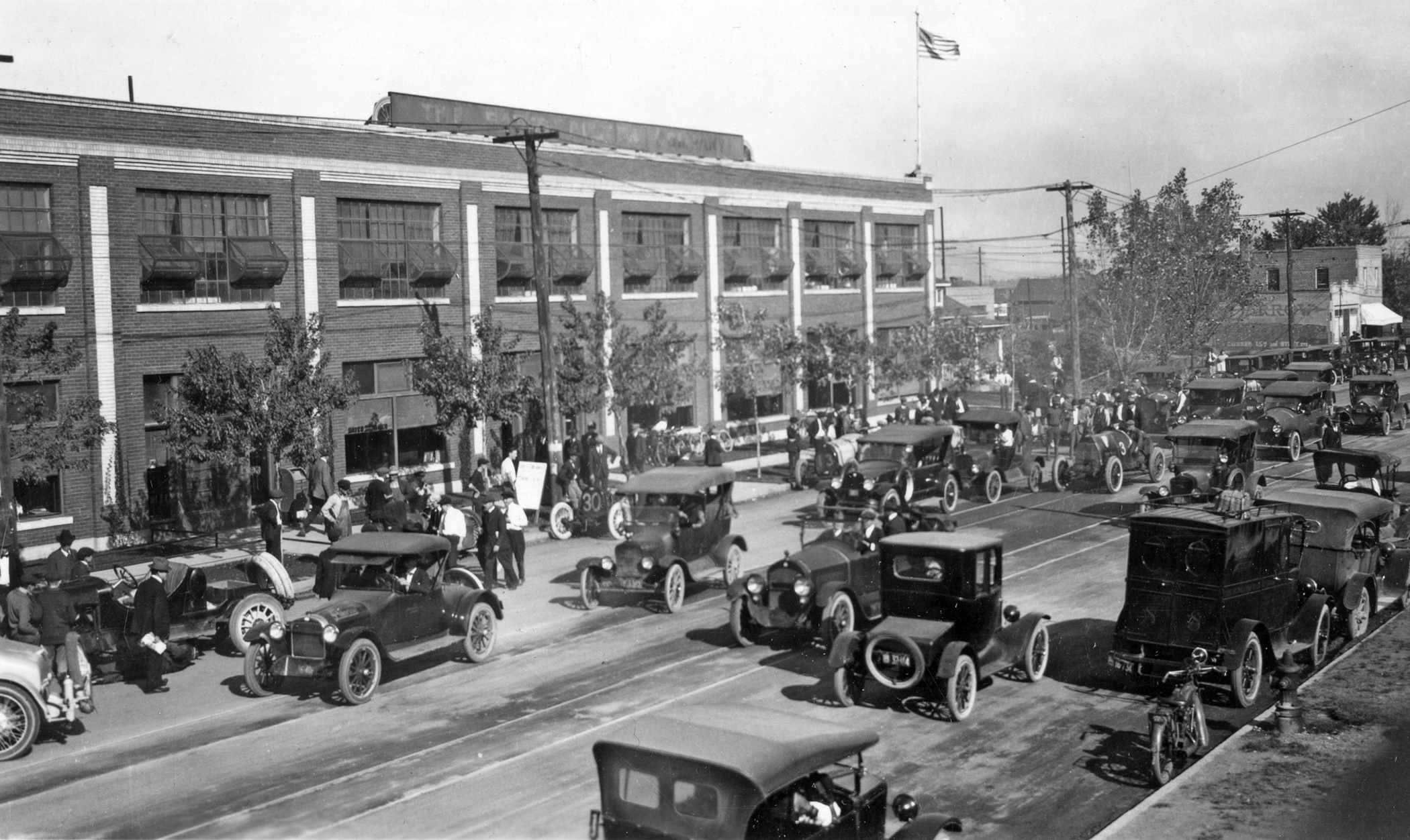Drivers navigate Denver traffic in the early 1920s outside of the Gates Rubber Company on South Broadway.