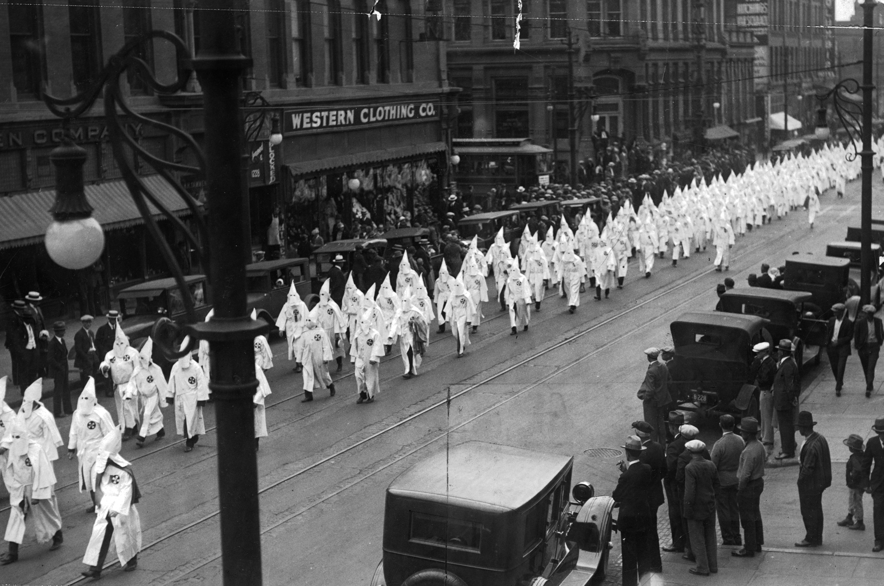 Members of the Klu Klux Klan march down 17th Street in Denver in 1926.