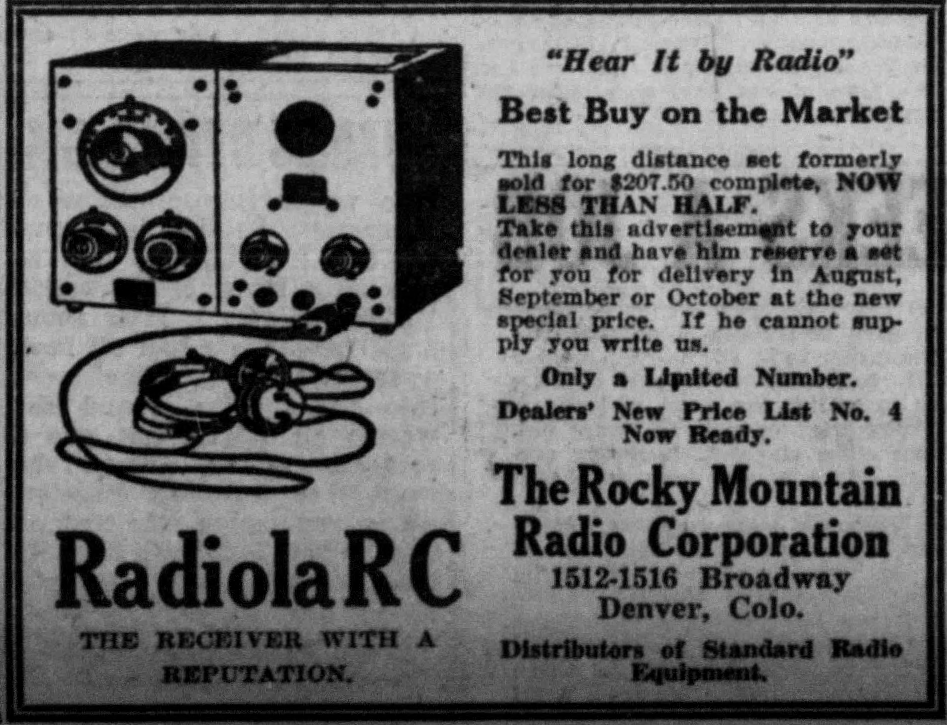 A radio advertisement from The Great Divide newspaper on August 22, 1923.