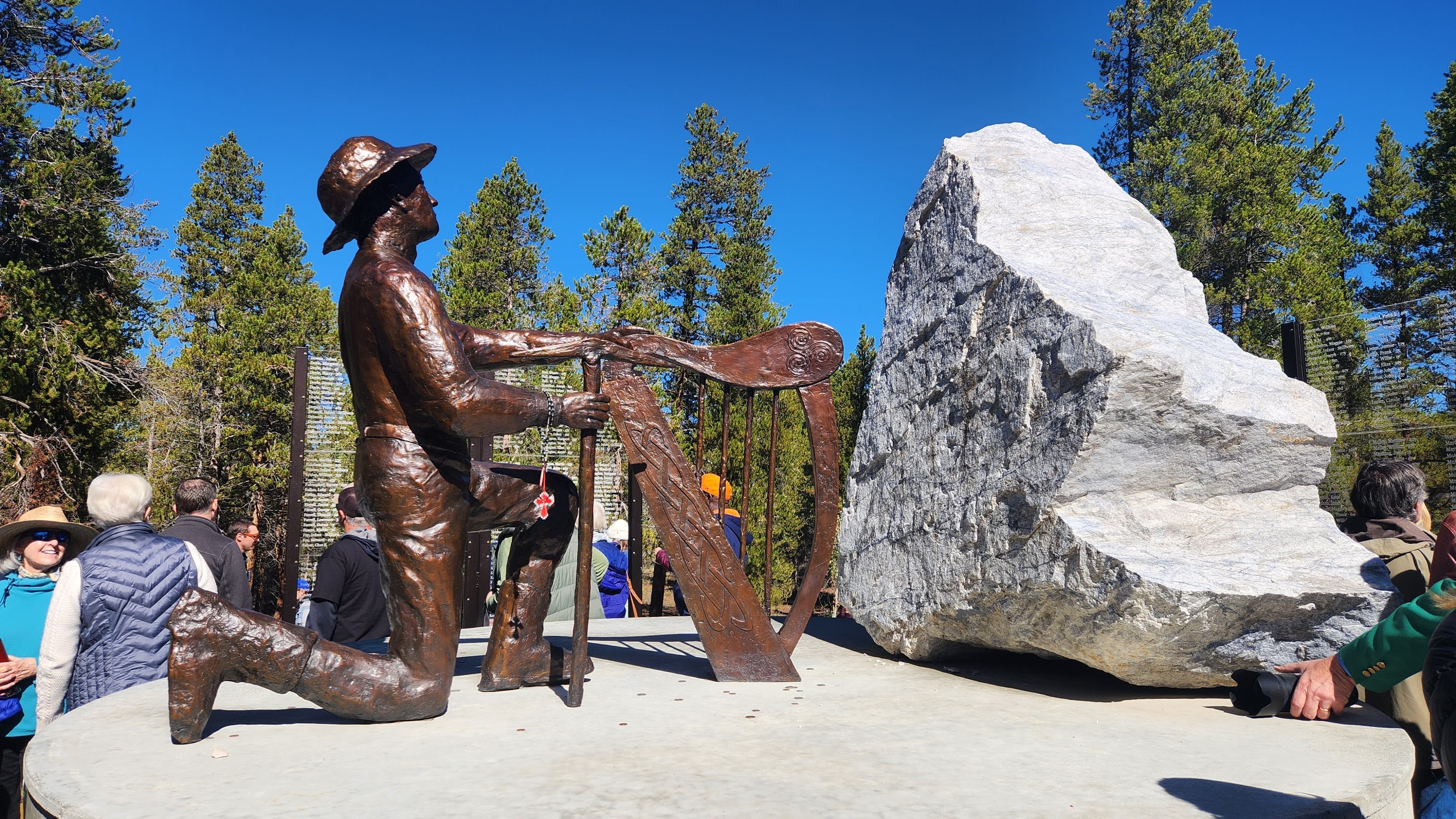 The centerpiece of the Leadville Miners' Memorial depicts a man with a pick, kneeling at an Irish harp.