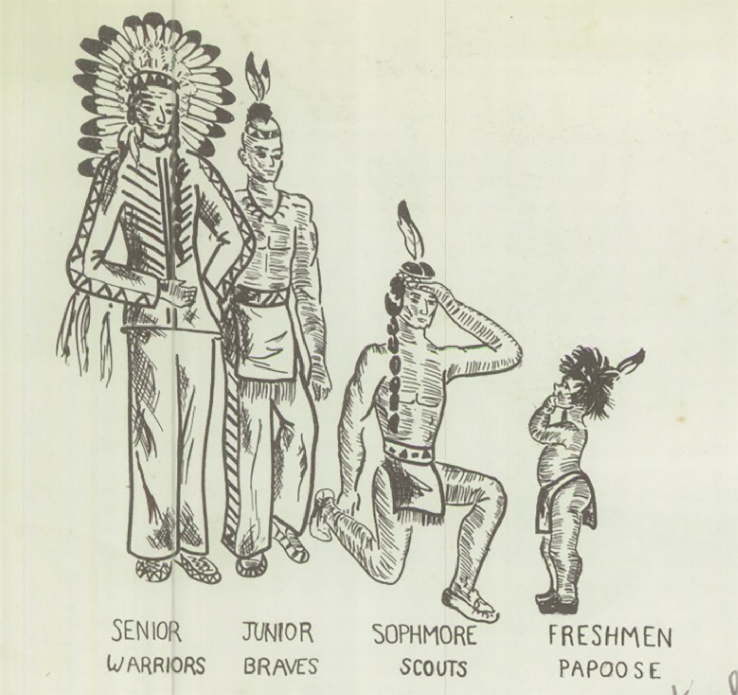 This poem is astonishingly discriminatory by modern standards, and typecasts Plains Natives as fanatical scalpers in order to mirror Lamar’s enthusiasm for high school sports. However, being a Lamar Savage incorporated not only athletic excellence but the entire educational experience. Another page sketched a “Freshmen Papoose” as an Indigenous infant with a single feather and “Senior Warriors” as headdress-wearing adults. Progressing through Lamar High’s ranks meant roleplaying a cartoonish and reductive portrayal of Indigenous peoples. These attitudes were still present fifty-three years later in 2001, when Lamar freshmen underwent an initiation ceremony which offensively required girls to dress as “Indian braves” and boys as “Indian squaws.” The Chieftain preserves alumni’s Savage days by fastening nostalgic memories to a caricatured representation of the peoples whose lands the Lamar Savages occupy.