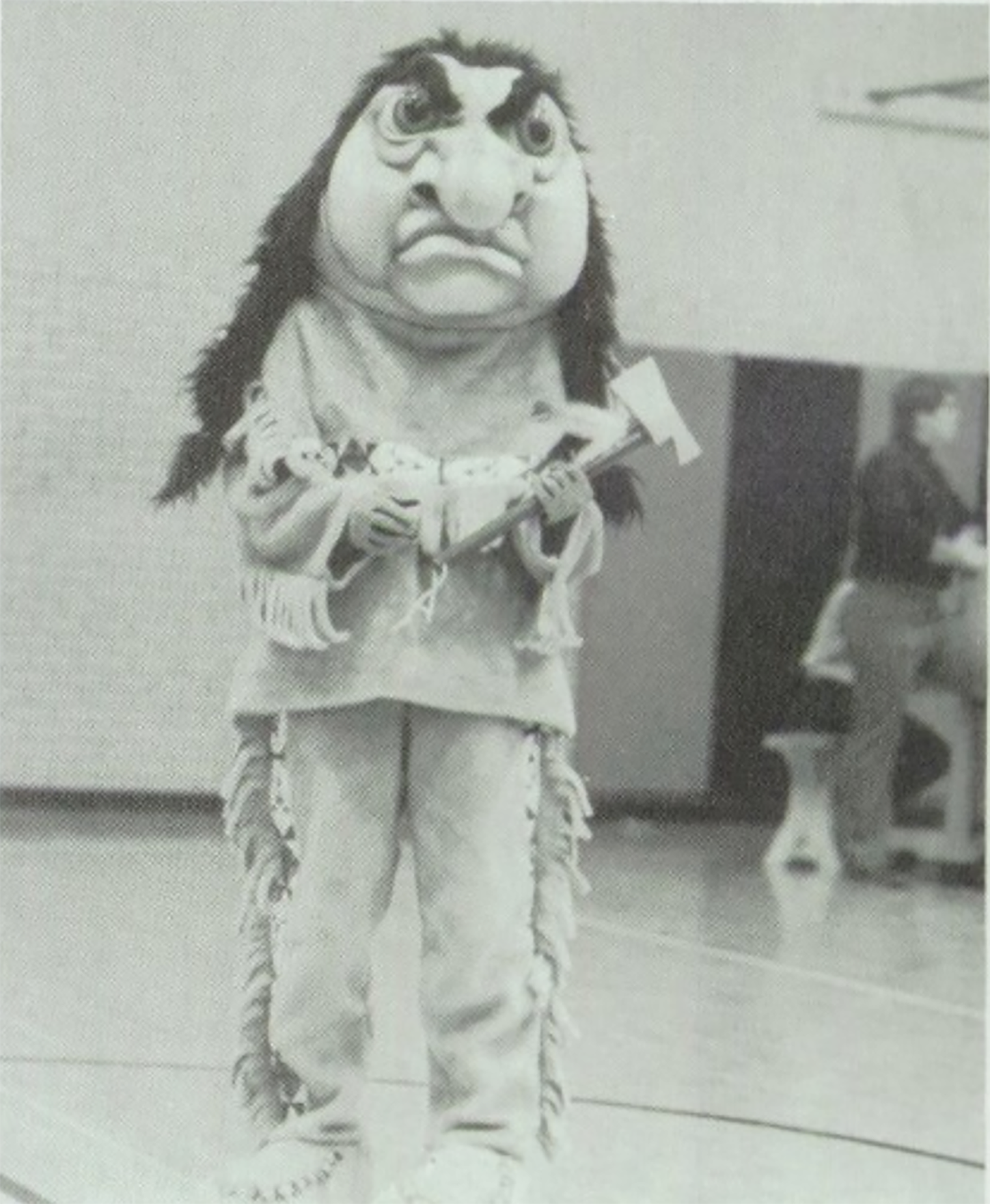 A 1986 initiative to “revive Lamar High School spirit” introduced a new costumed mascot: a wide-eyed, bulbous-nosed, tomahawk-wielding Indigenous caricature named “Chief Ugh-Lee.” At games across the state, Chief Ugh-Lee applauded opponent misses and cursed their scored baskets, providing an interactive exchange with a costumed embodiment of Lamar’s “Savage Spirit.”