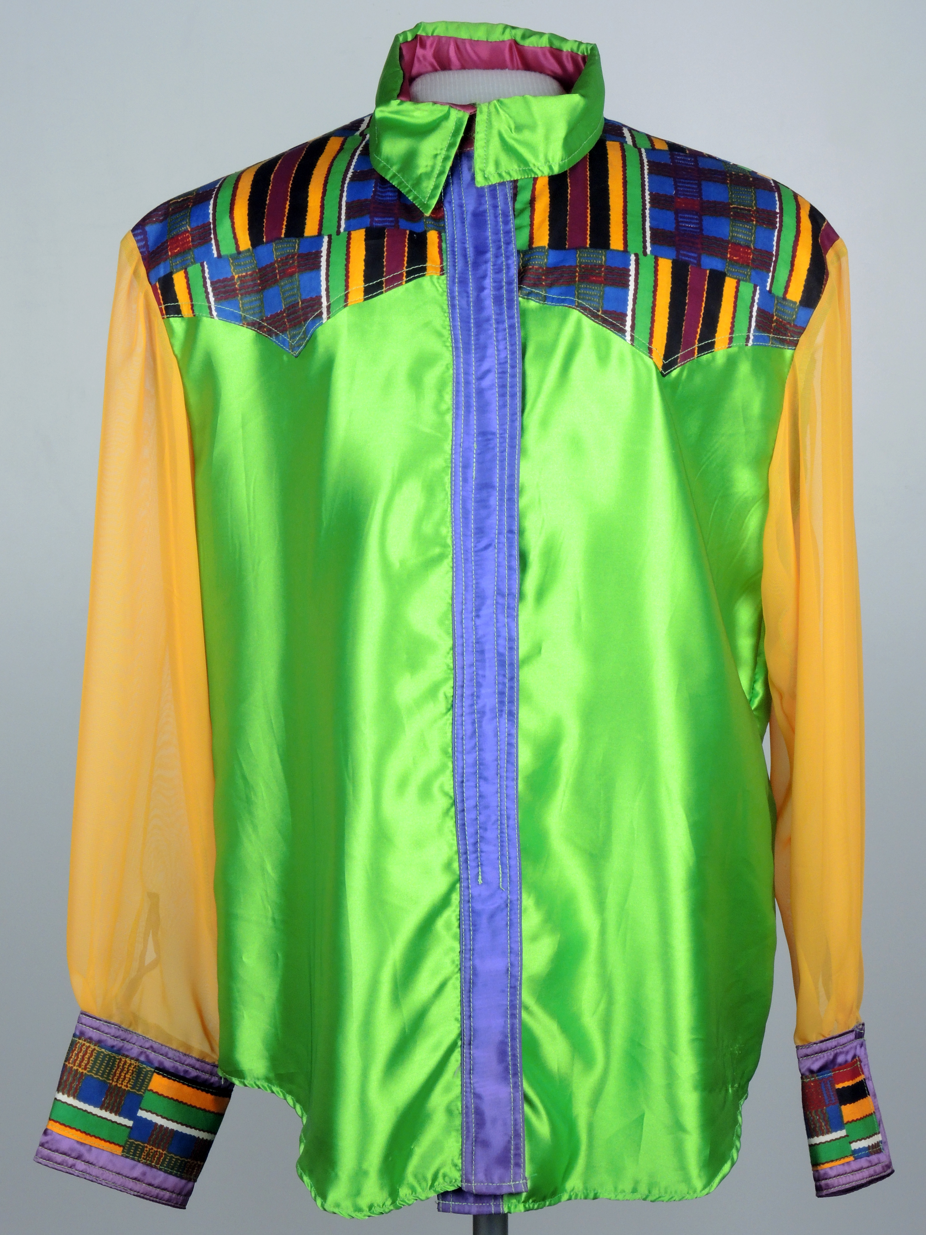 With this history in mind, I began surveying the collection at History Colorado for items that illuminate the Black experience. Peeking down one of the stacks in storage, a brightly colored shirt flashed out to me. As I drew closer I was immediately struck by the traditional African kente cloth sewn around the cuffs and shoulders.