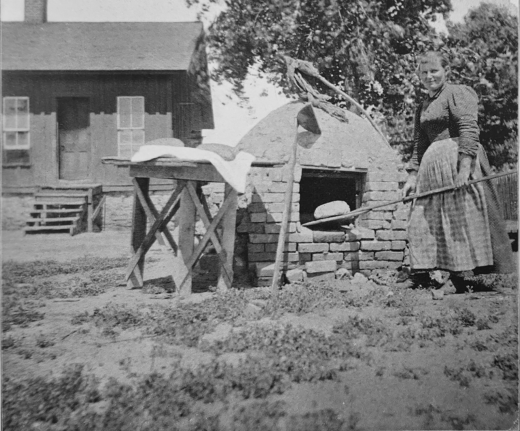 An Italian woman baking bread in an outdoor oven at El Moro, about 1901–1902.
