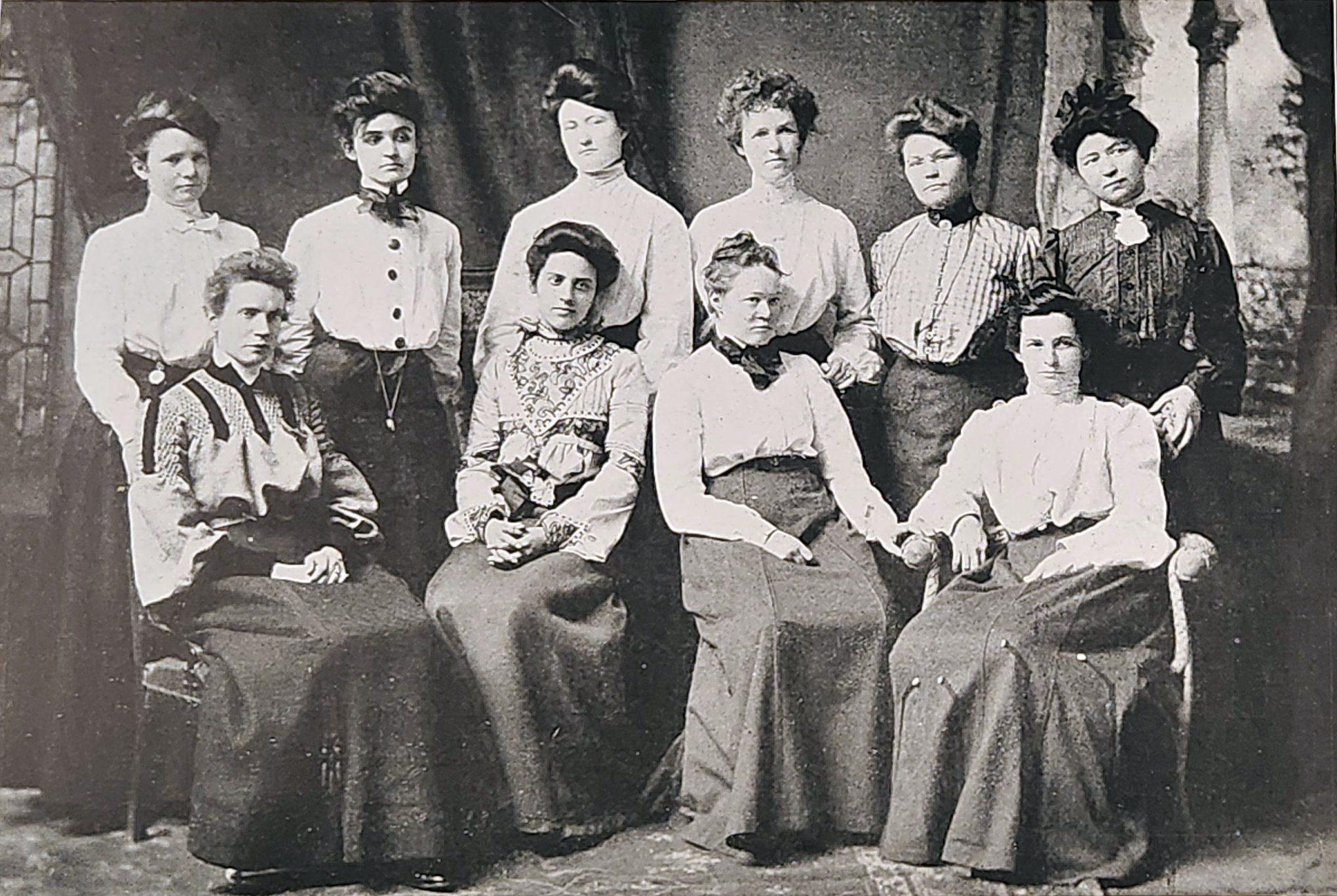 Kindergarten teachers employed by Colorado Fuel & Iron Company, around 1903–1904. Kindergarten Superintendent Margaret Grabill is in the top row, fourth from the left.