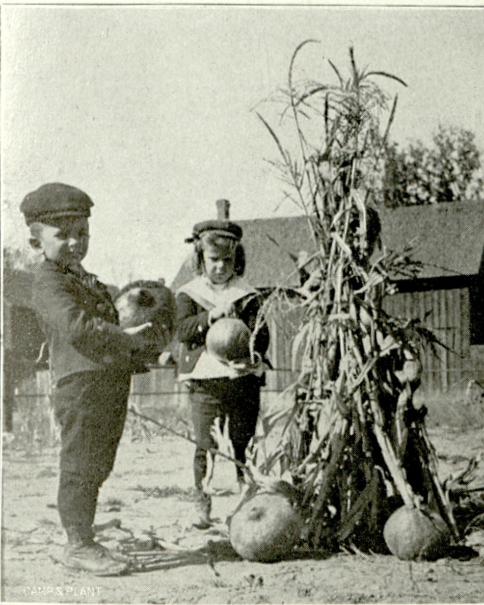 Two kindergarten boys displaying their fall harvest, around 1902.