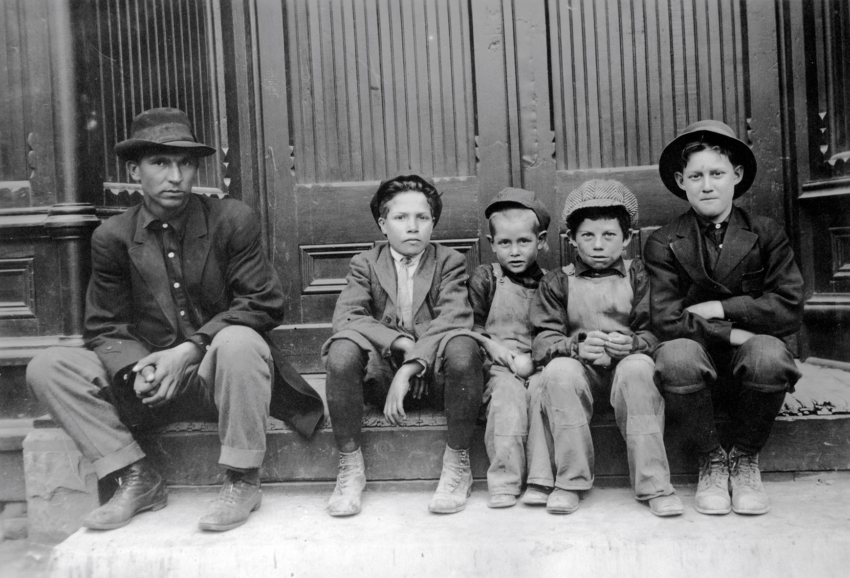 A miner and his young sons sitting on a stoop in Las Animas County, Colorado, during the 1914 Colorado Coalfield Strike.
