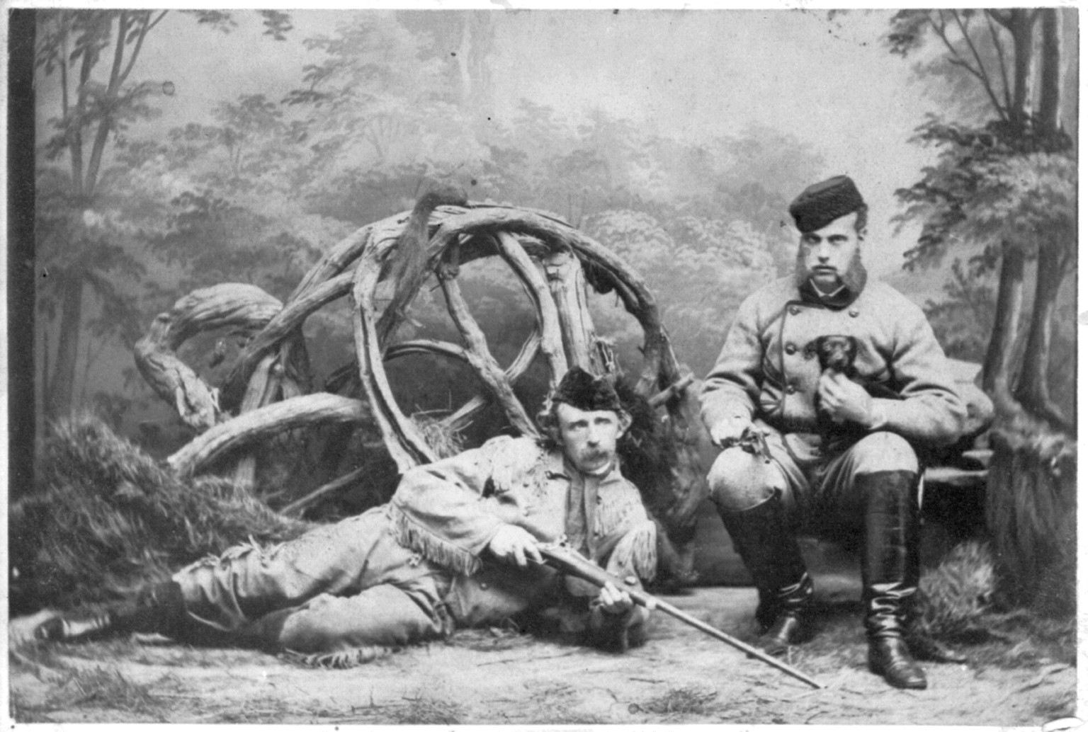 Grand Duke Alexis (right) posing for a photo with a puppy while dressed in hunting uniform, while General Custer (left) lounges with a rifle. This studio photo was likely taken shortly after the “Great Royal Buffalo hunt” in western Kansas, January 1872.