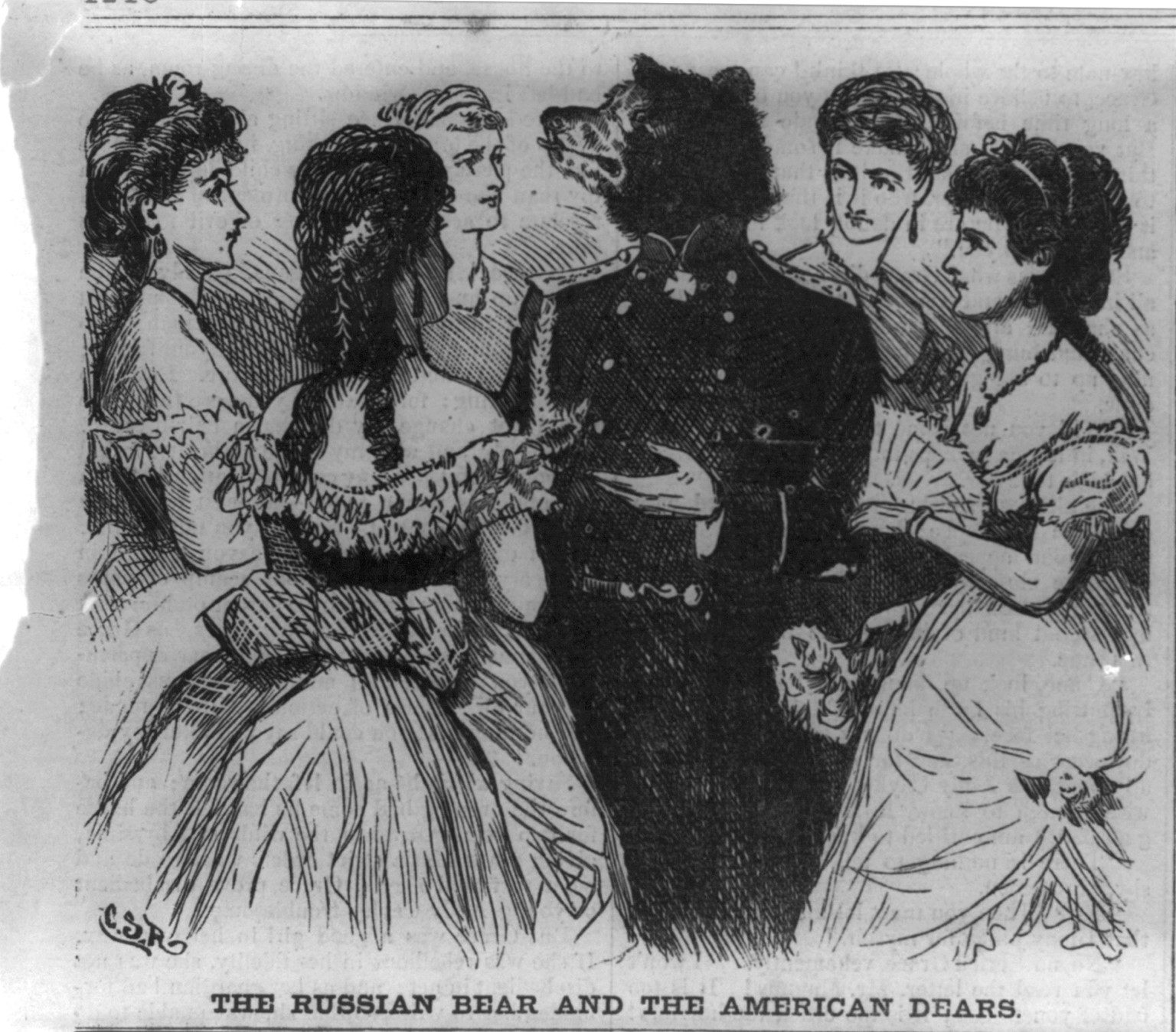This political cartoon depicts Grand Duke Alexis as “the Russian Bear”, surrounded by young women. This is in reference to the celebrity Alexis enjoyed during his tour of the United States.