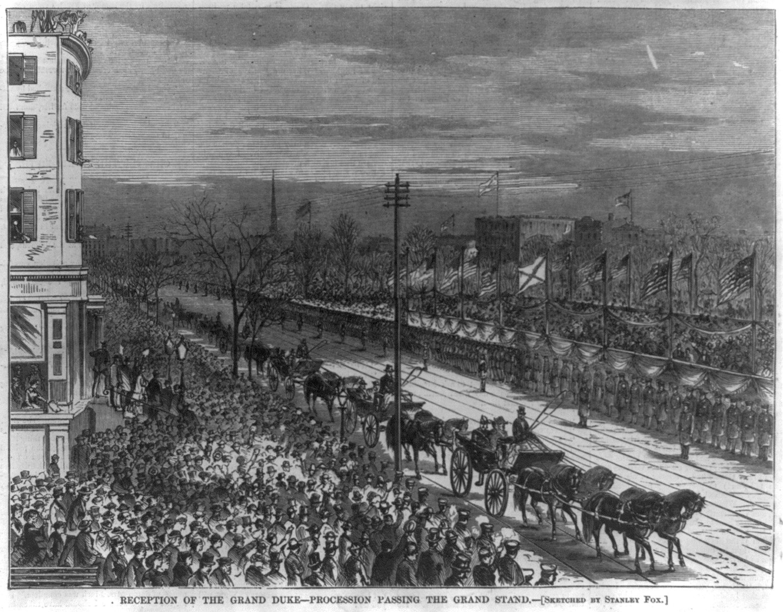 A newspaper illustration depicting the grand reception of Grand Duke Alexis at New York City, his first stop in the United States.