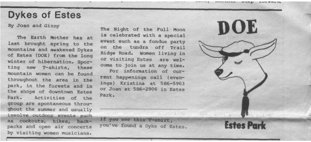 In a similar vein of interest, the Dykes of Estes, or DOE, also frequently advertised for women to come visit the Rocky Mountain National Park. Their mission was to “organize meaningful women’s tours of the Rockies for our visitors.” DOE often wrote “Mountain Musings” for Double Standard and often included a callout for any woman interested in visiting, or living in the area, to join in on any DOE activity. Typical DOE activities would be hiking, fishing, and skiing in the Rockies; some of the “Mountain Musings” would share DOE opinions on recent films, or even the activities of recent guests. DOE reflected the Colorado lesbian alignment with the women’s community in their musings.