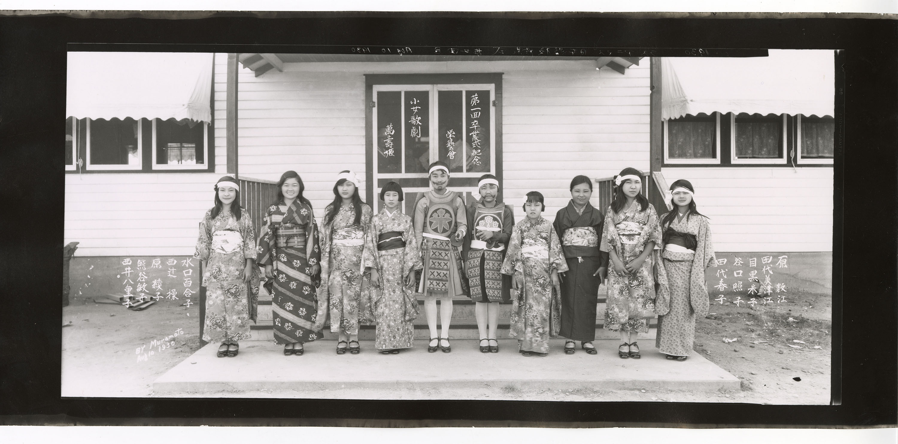 A group of girls in theatrical costume, standing on the porch of the Japanese-language school near Rye. The caption in Japanese reads: “First graduation memorial ceremony, Girl’s musical, Manju Hime.” The names of the girls are recorded on either side of them.