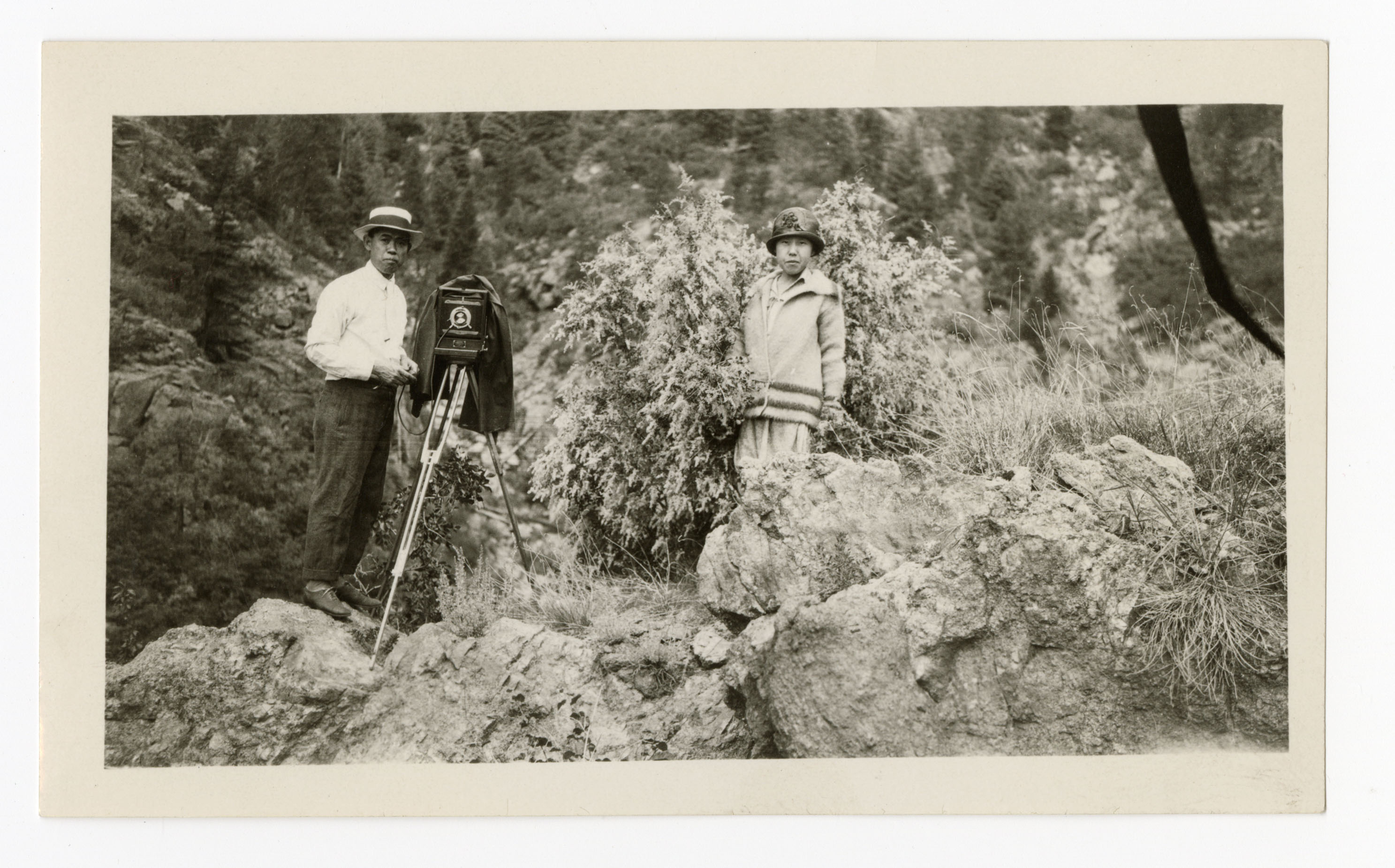 Frank and Asa Muramoto on a hike in the 1940s. Frank has with him one of his cameras on a tripod. The photo was likely taken by one of their children.