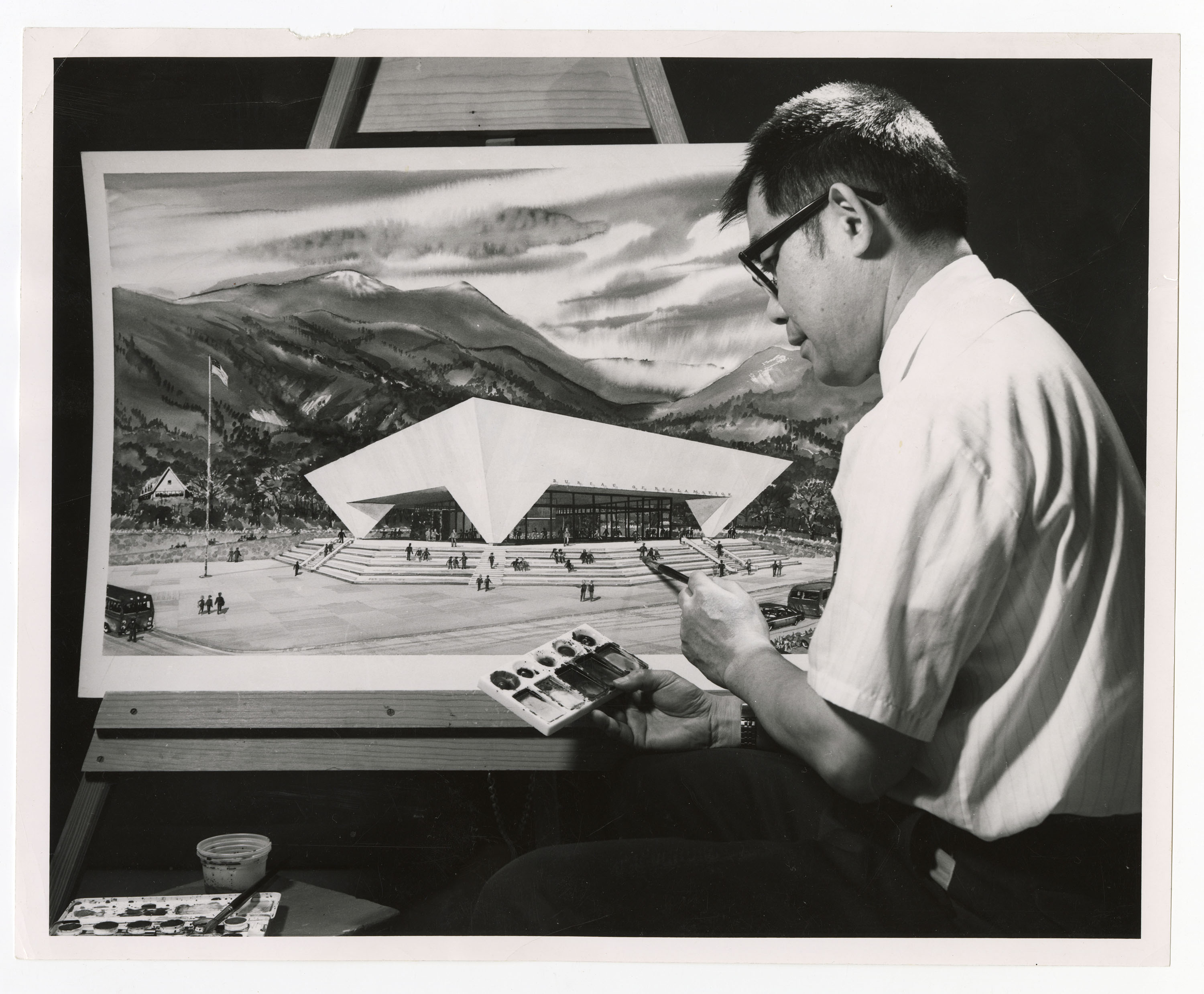 James Muramoto, architect and son of Frank and Asa Muramoto, painting on an easel, around the 1950s.