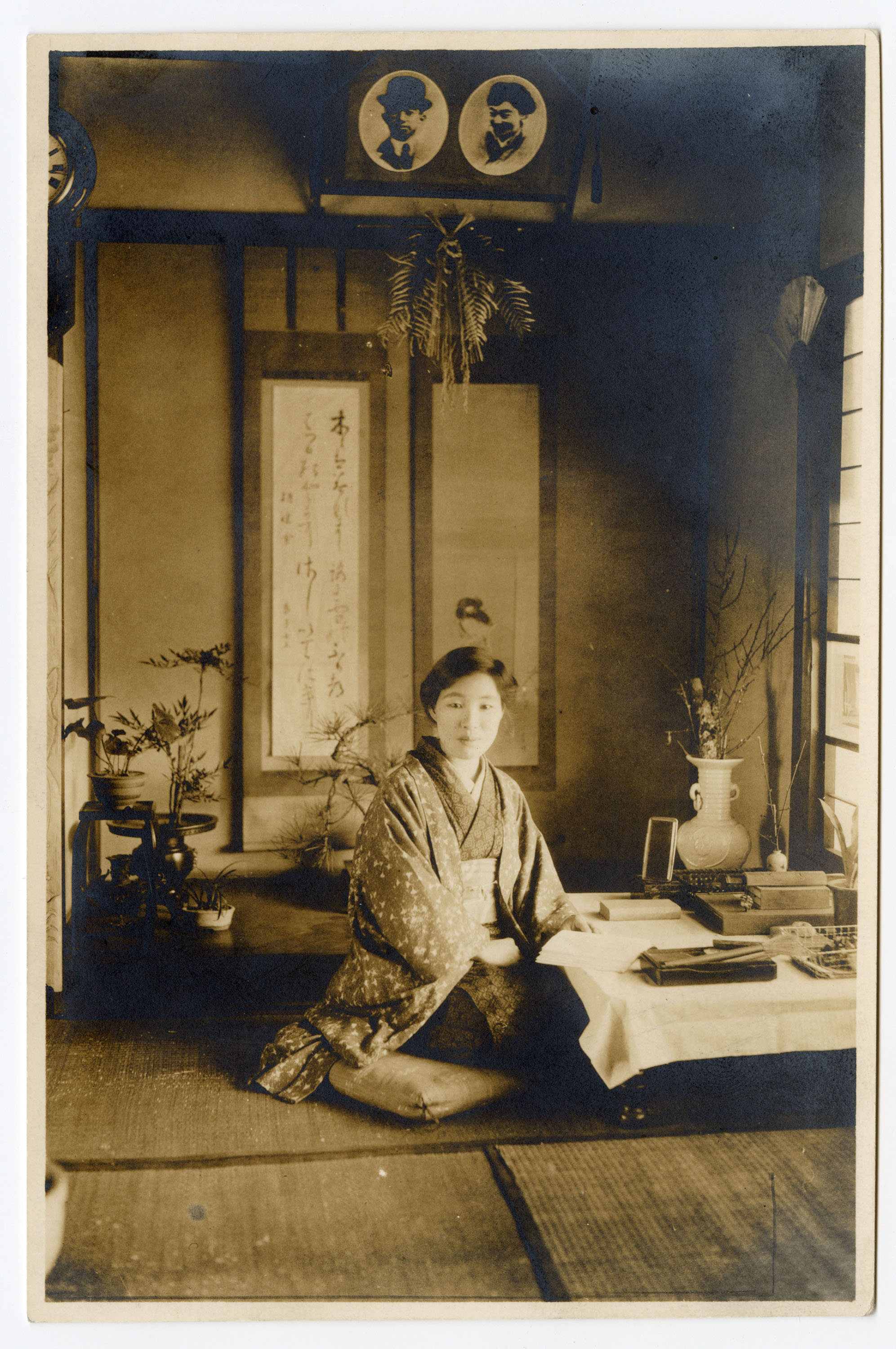 Frank Muramoto’s sister sitting at a table in a house in Japan, around the 1910s.