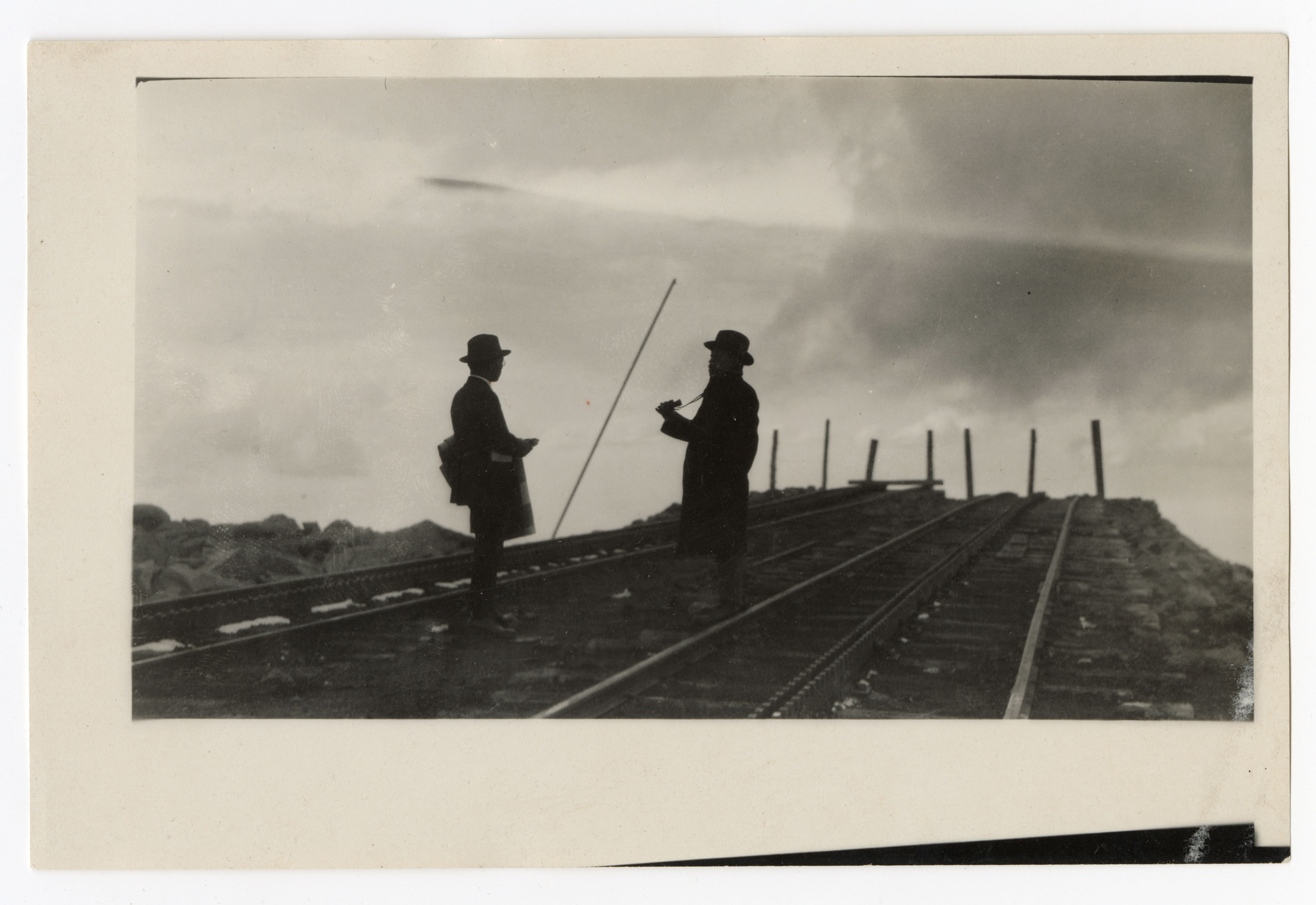 Two men, possibly friends or family members, observing an unfinished railroad bridge somewhere in the Colorado Rockies, around the 1940s.