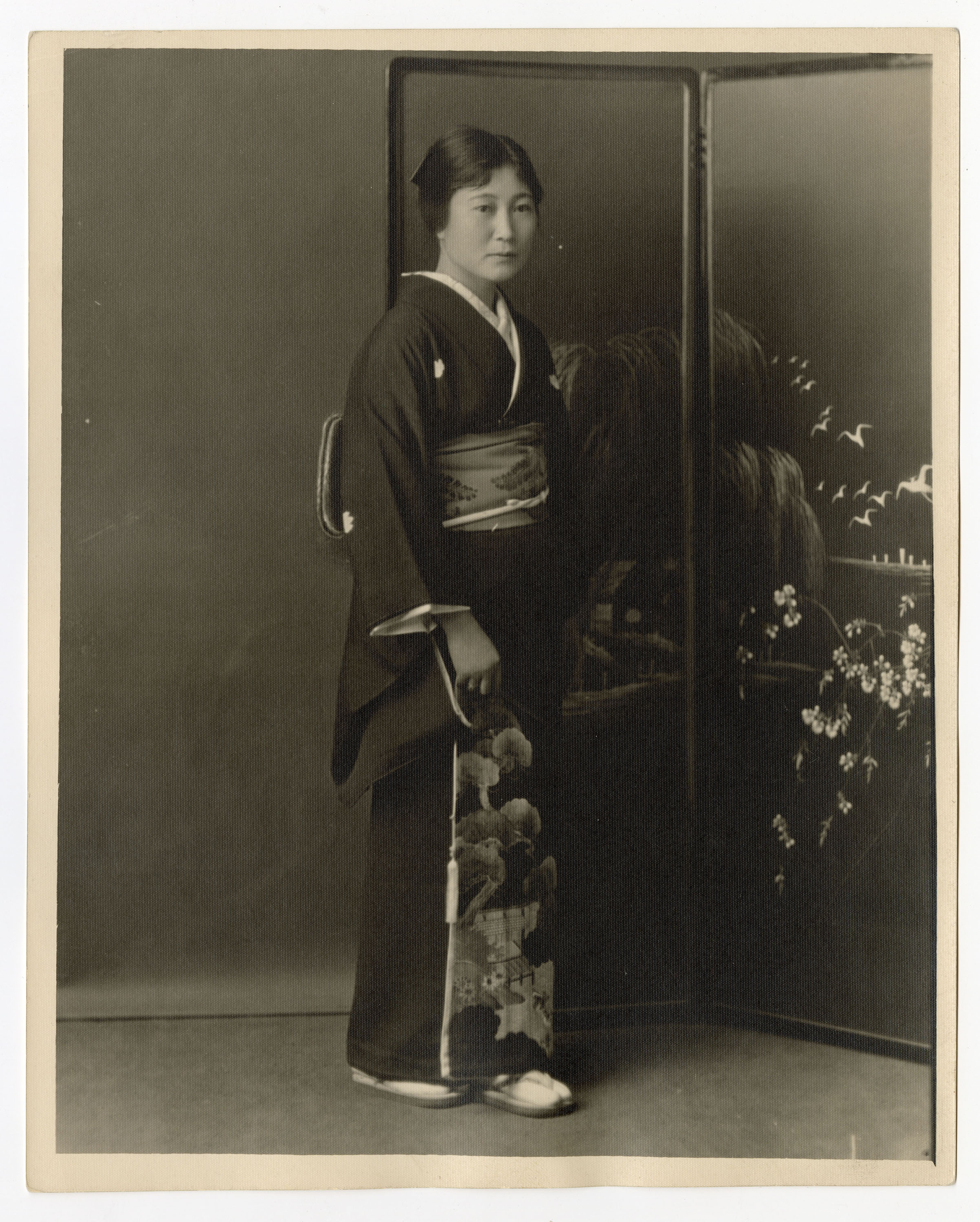 Studio portrait of an unidentified Japanese American woman in kimono with Japanese-style folding screen, around the 1930s.