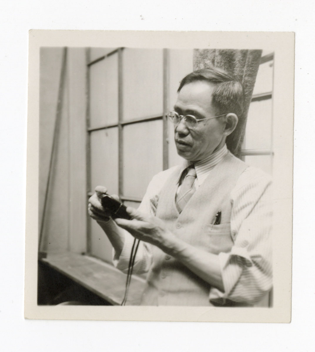Frank Muramoto examining a flash bulb, sometime around the 1930s or 1940s.