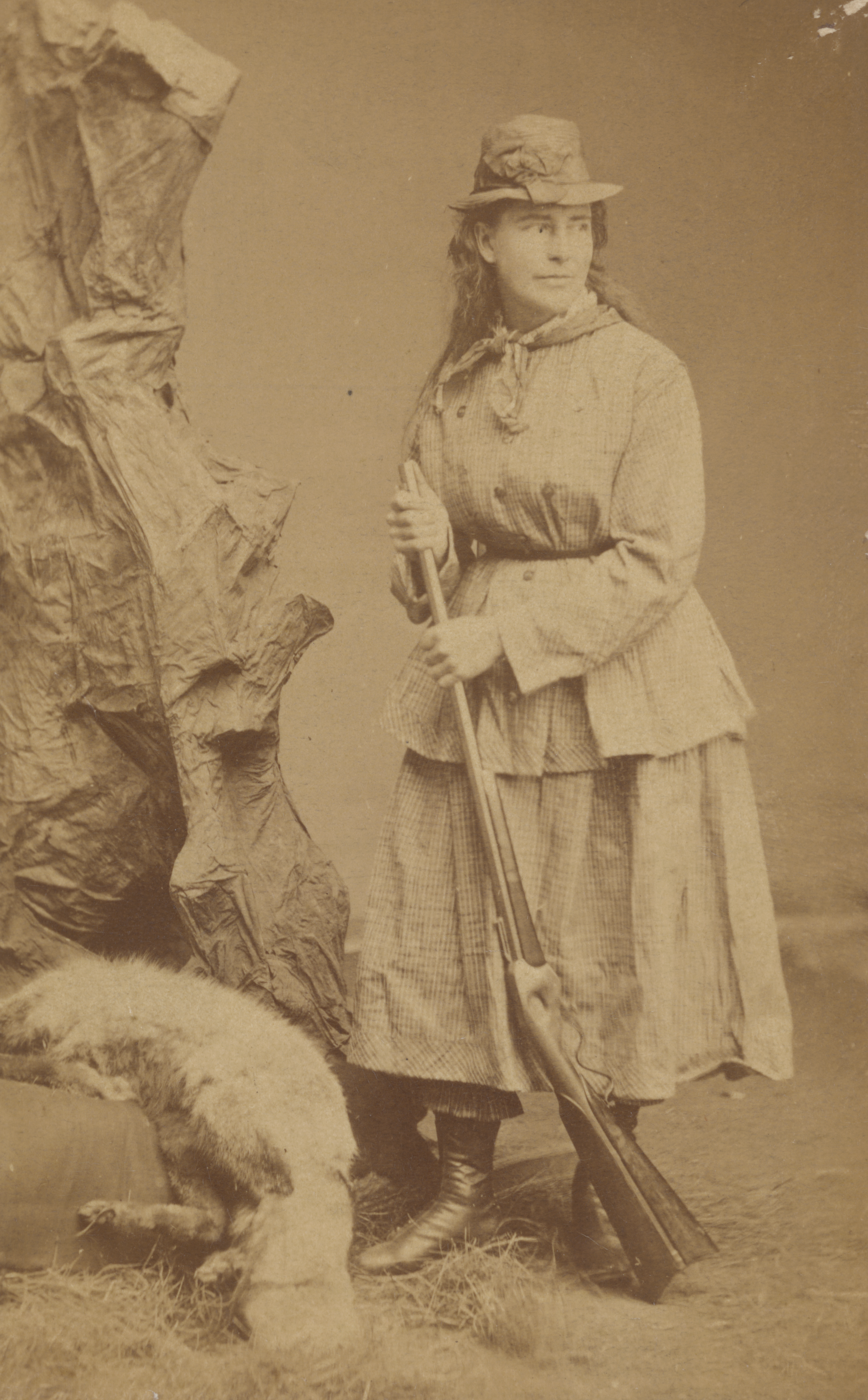 Martha Maxwell poses with a gun and an animal