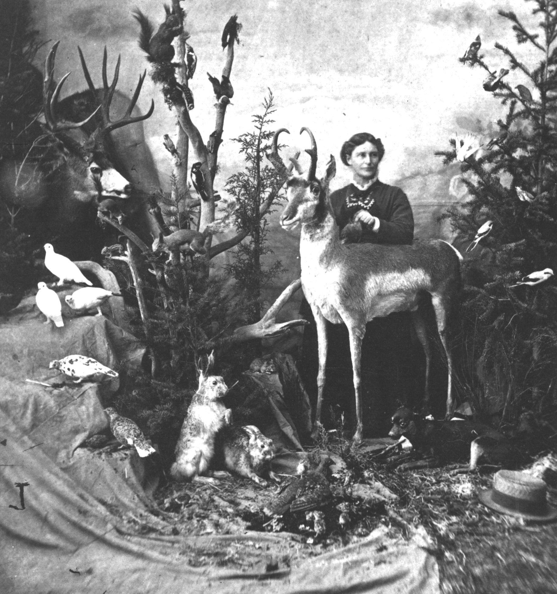 Martha Maxwell poses at her desk with animals she has preserved, in a photograph titled In the Work Room.