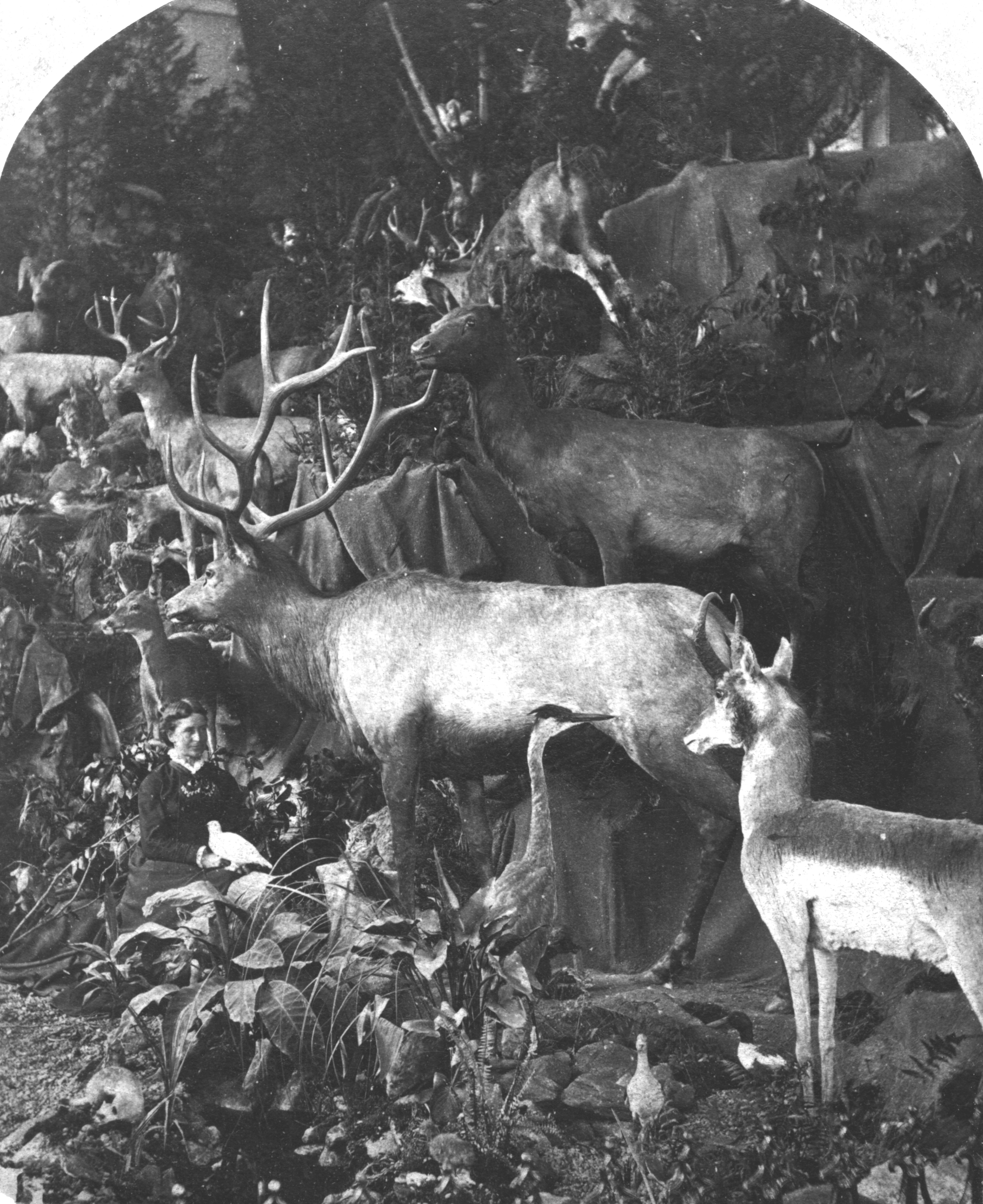 Martha Maxwell stands with specimens and preserved animals.