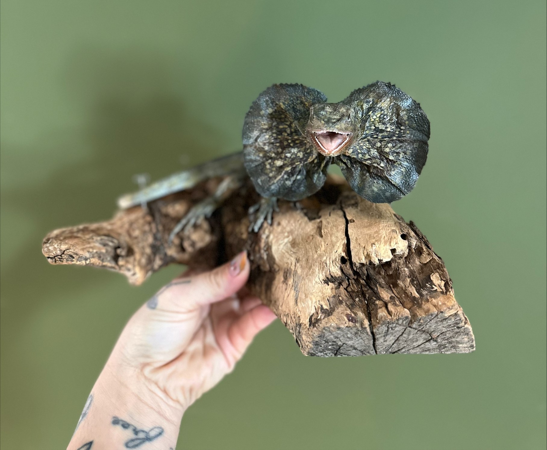 A taxidermy reptile specimen poses on top of a piece of wood.