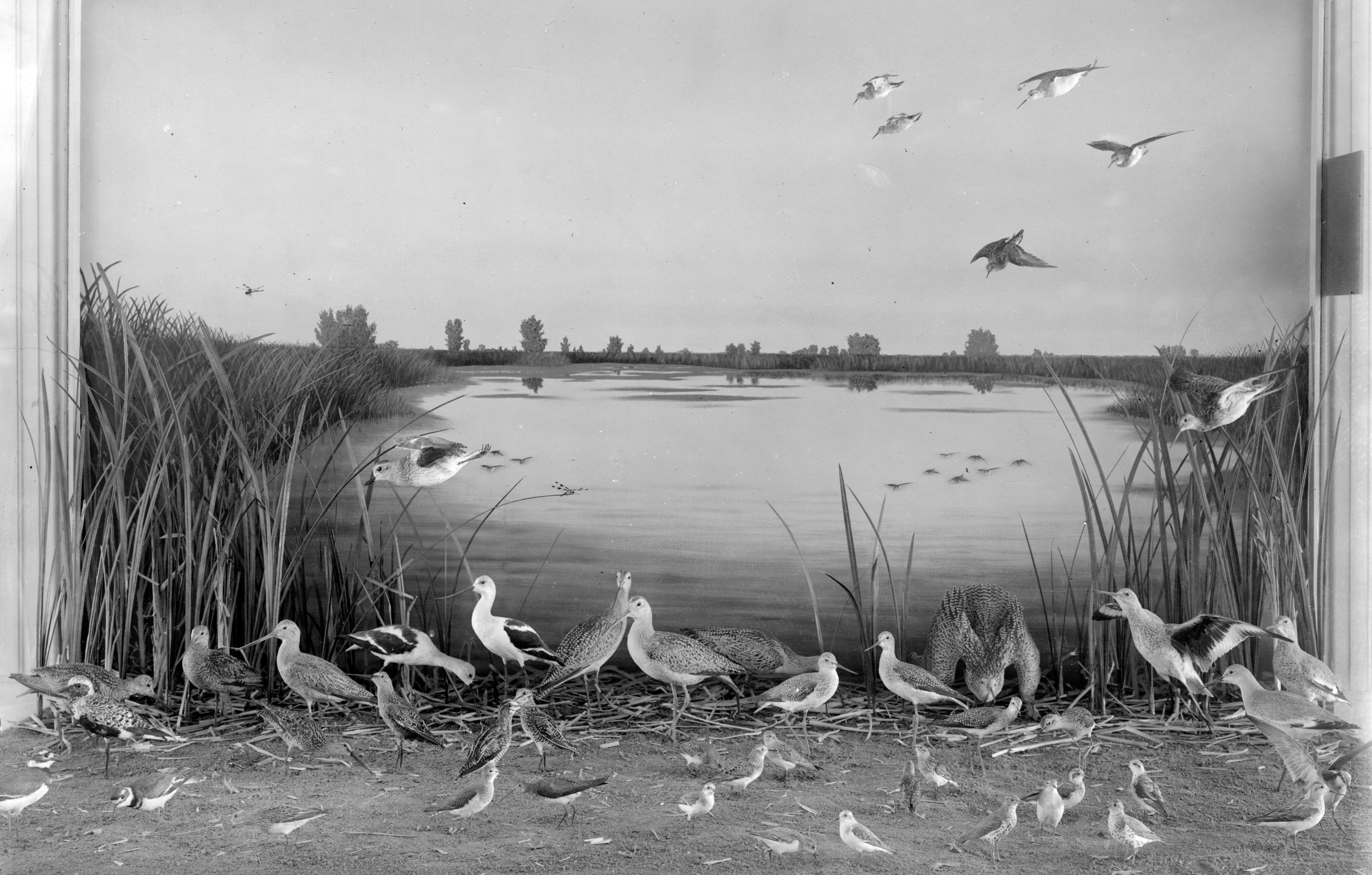 Shore Birds grouping, about 1911. Handwritten on original negative envelope: "#2682 Bird Studies (Shore Birds)" "EB-x-25 Barr Lakes Region Group Shore Birds. Colo. Bird Hall. 1911 Dismantled 1917."