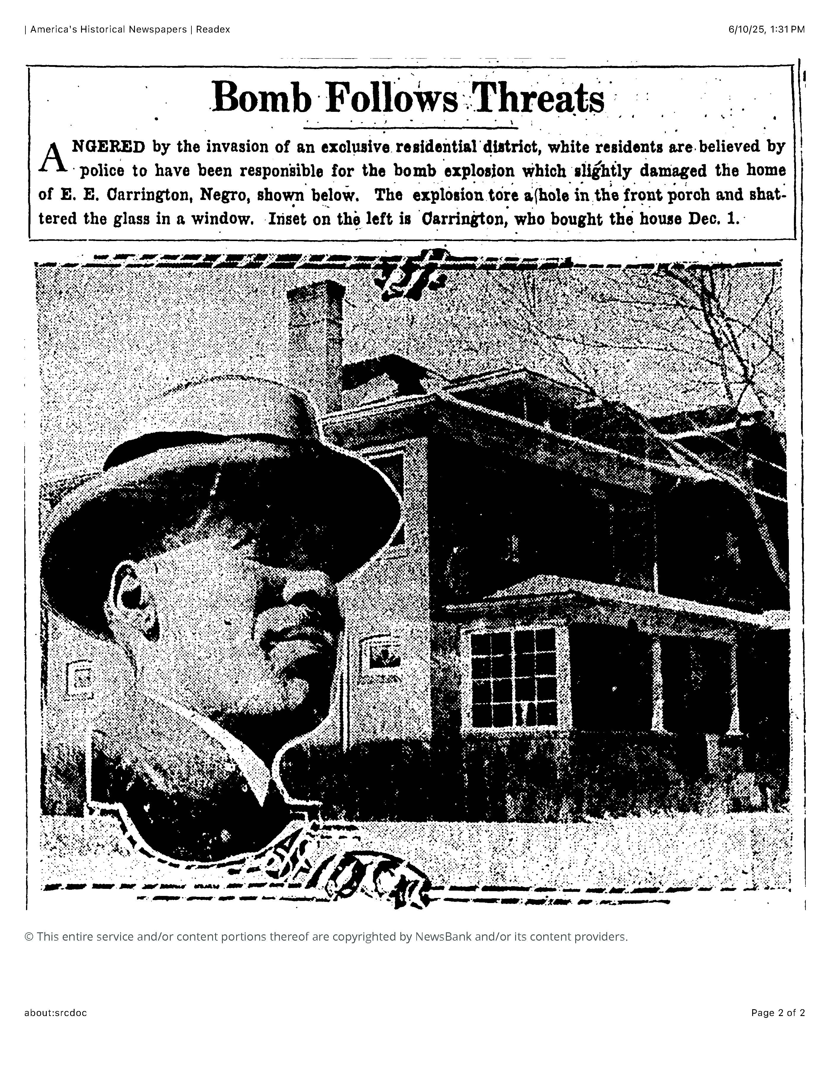 Now the Carringtons requested nightly police protection, which the city provided. But they still were not safe. Early one evening in January, about two weeks after the shootings, E.E. Carrington was in his front room chatting with a friend when they heard something land on the porch. Carrington rushed outside and saw a bomb. Thinking quickly, he chucked it into the street, where it detonated with only minor harm to a neighboring house.