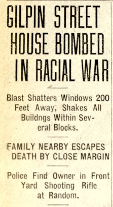 A clipping of a newspaper headline reading "Gilpin Street House Bombed in Racial War"