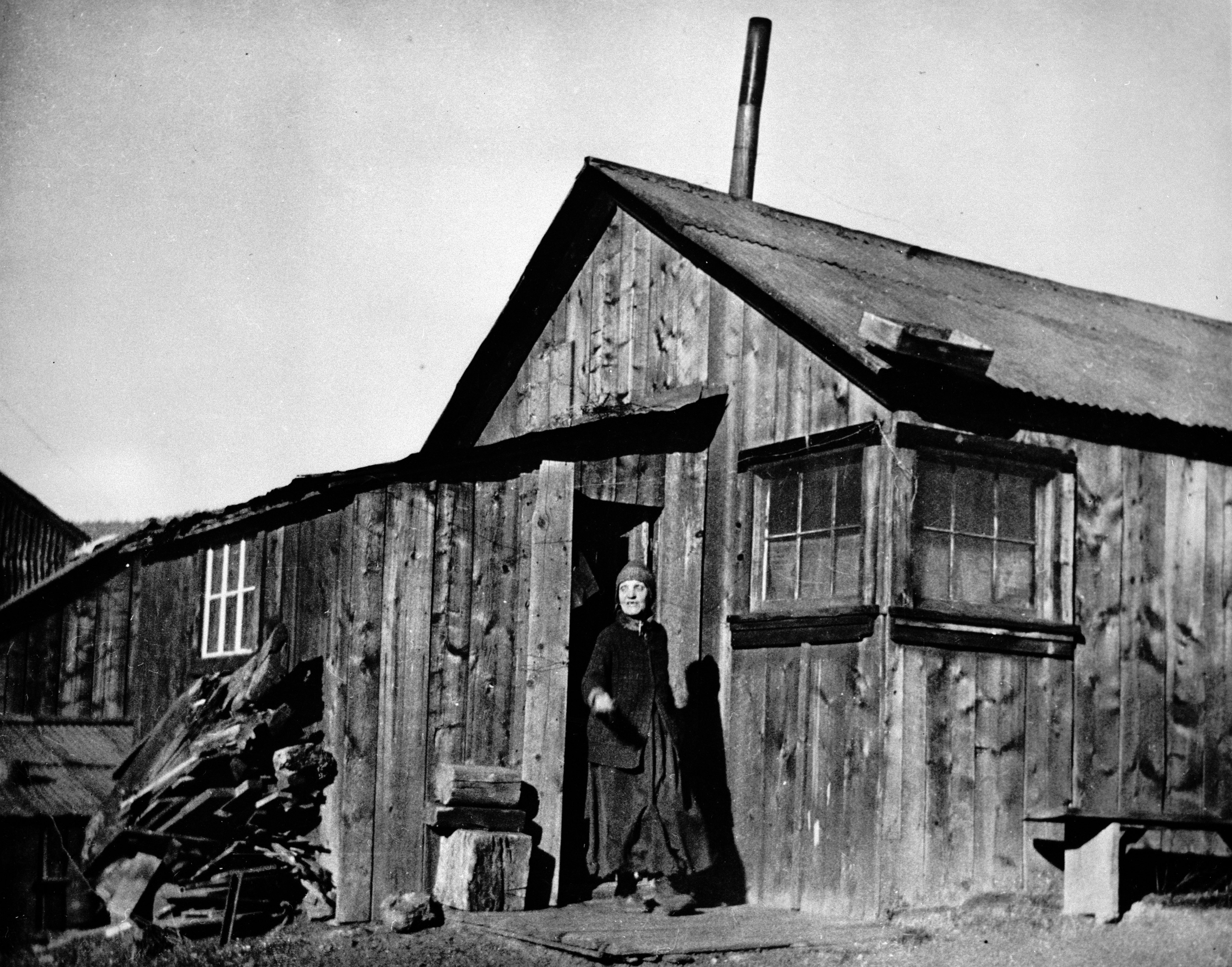 One of the last known photographs of Elizabeth Tabor, taken outside the cabin where she lived near the Matchless Mine.