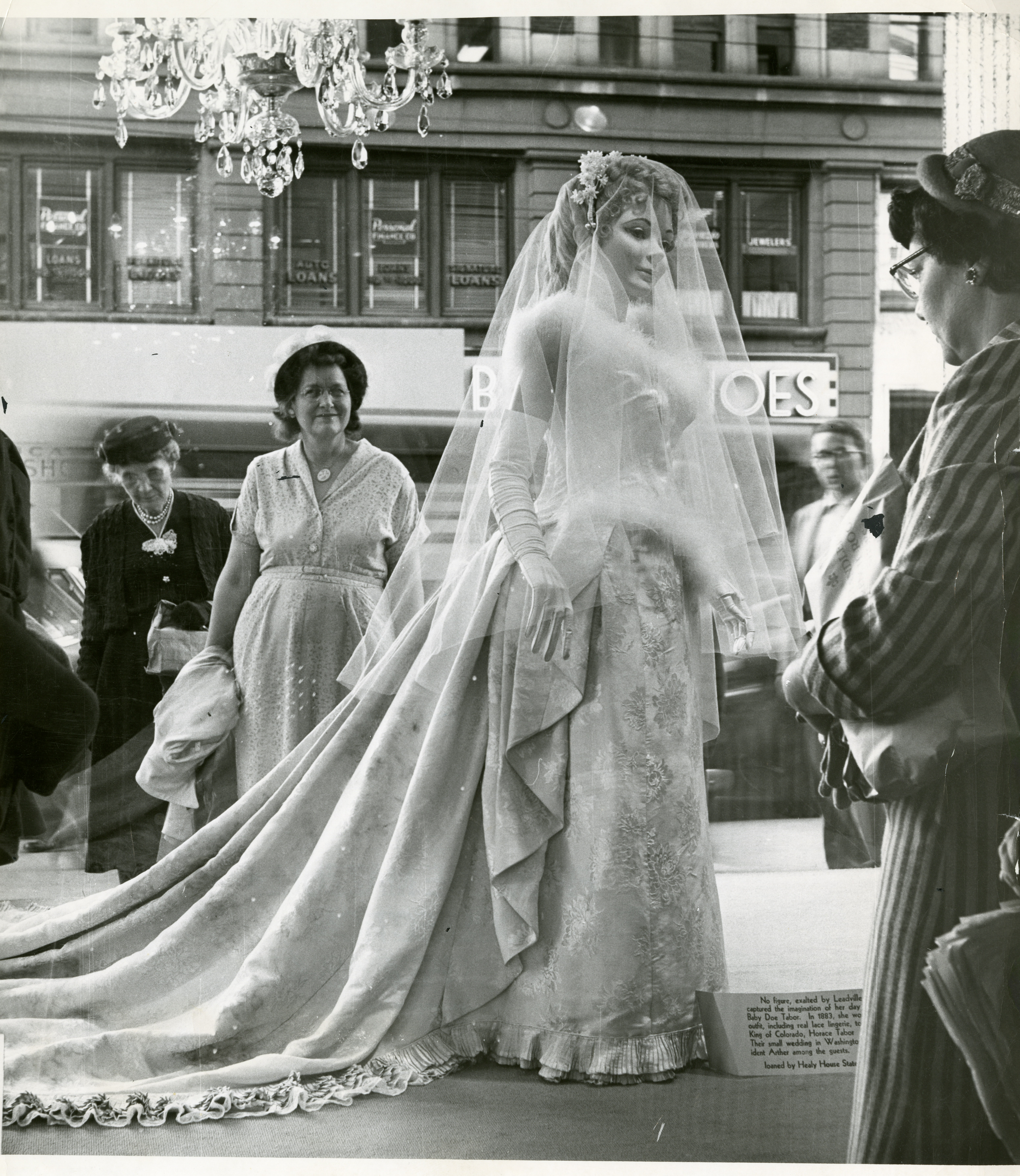 The wedding gown of Elizabeth “Baby Doe” Tabor on display at the May Company’s 75th anniversary celebration in Denver, 1952.