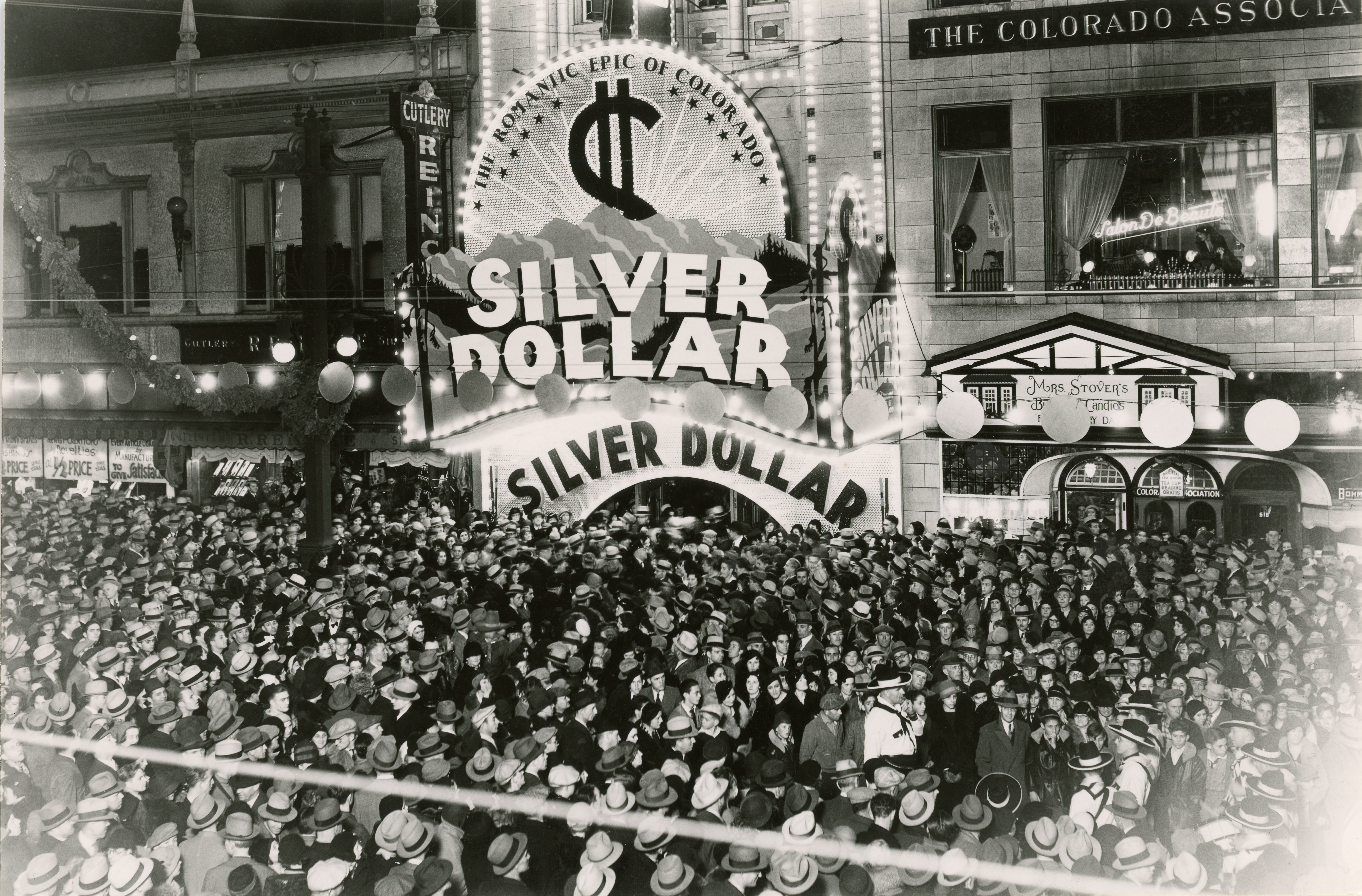 A large crowd gathered outside a Denver theater for the premiere of the motion picture “Silver Dollar,” 1932.