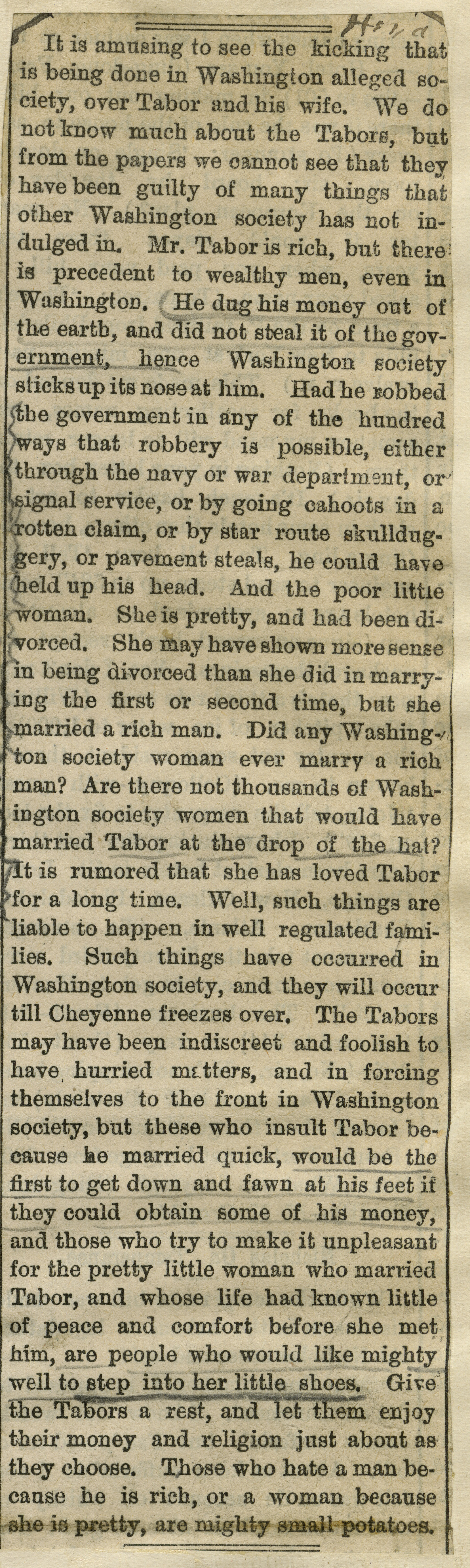 The Tabors may have been indiscreet and foolish to have hurried matters, and in forcing themselves to be the front in Washington society, but those who insult Tabor because he married quick, would be the first to get down and fawn at his feet if they could obtain some of his money, and those who try to make it unpleasant for the pretty little woman who married Tabor, and whose life had known little of peace and comfort before she met him, are people who would like mighty well to step into her little shoes.
